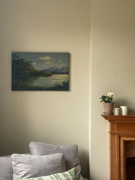 Vintage Original Lake and Mountain Landscape Oil Painting on Canvas