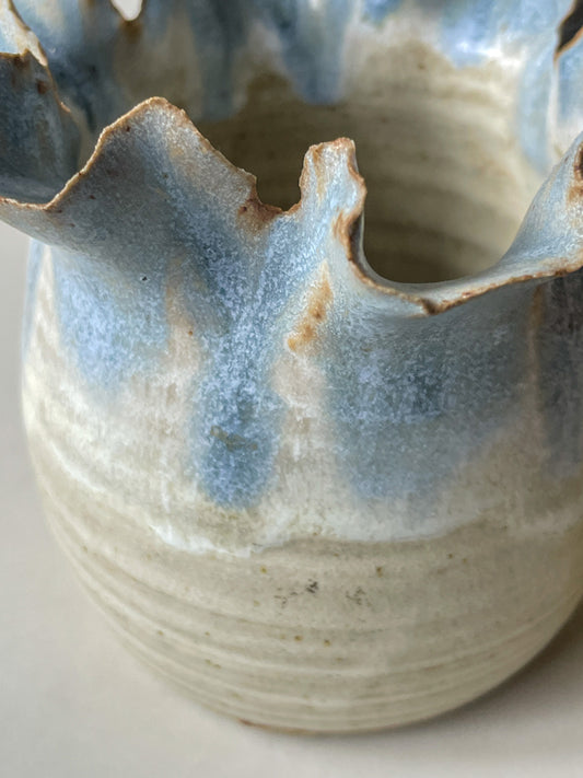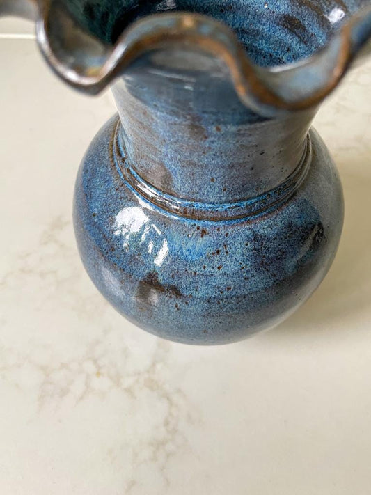 Vintage Blue Glazed Studio Pottery Vase with Scalloped Rim