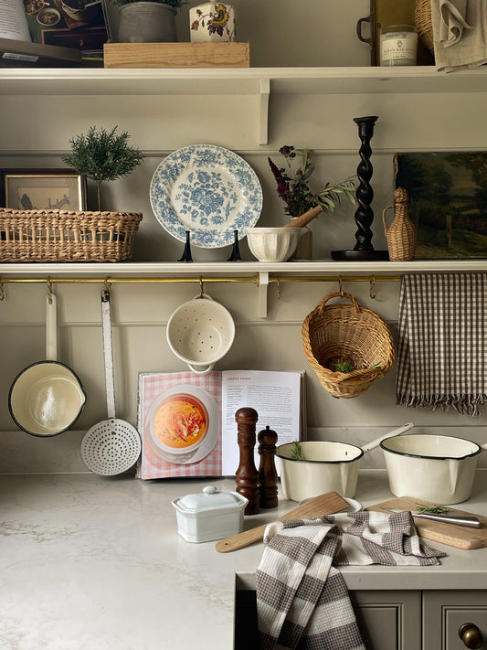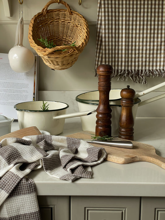 Vintage Cream Enamel Saucepan Trio with Green Rim