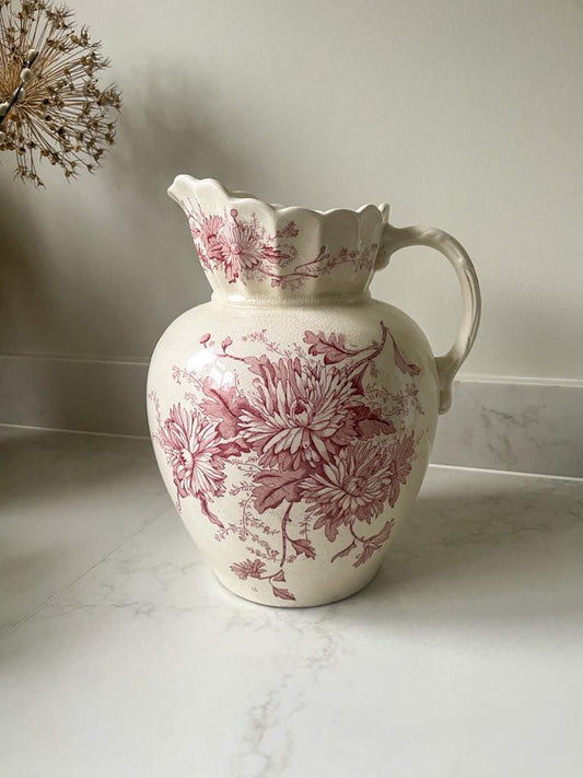 Large Vintage White and Pink Detailed Floral Vintage Ceramic Pitcher Vase