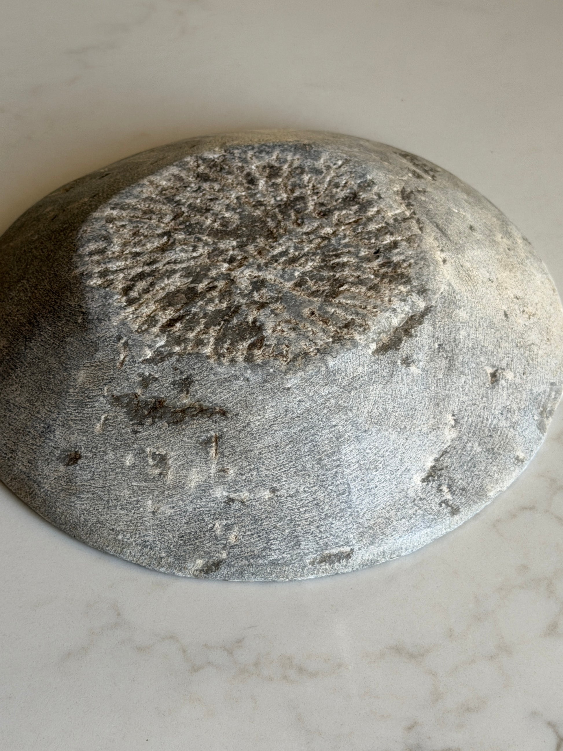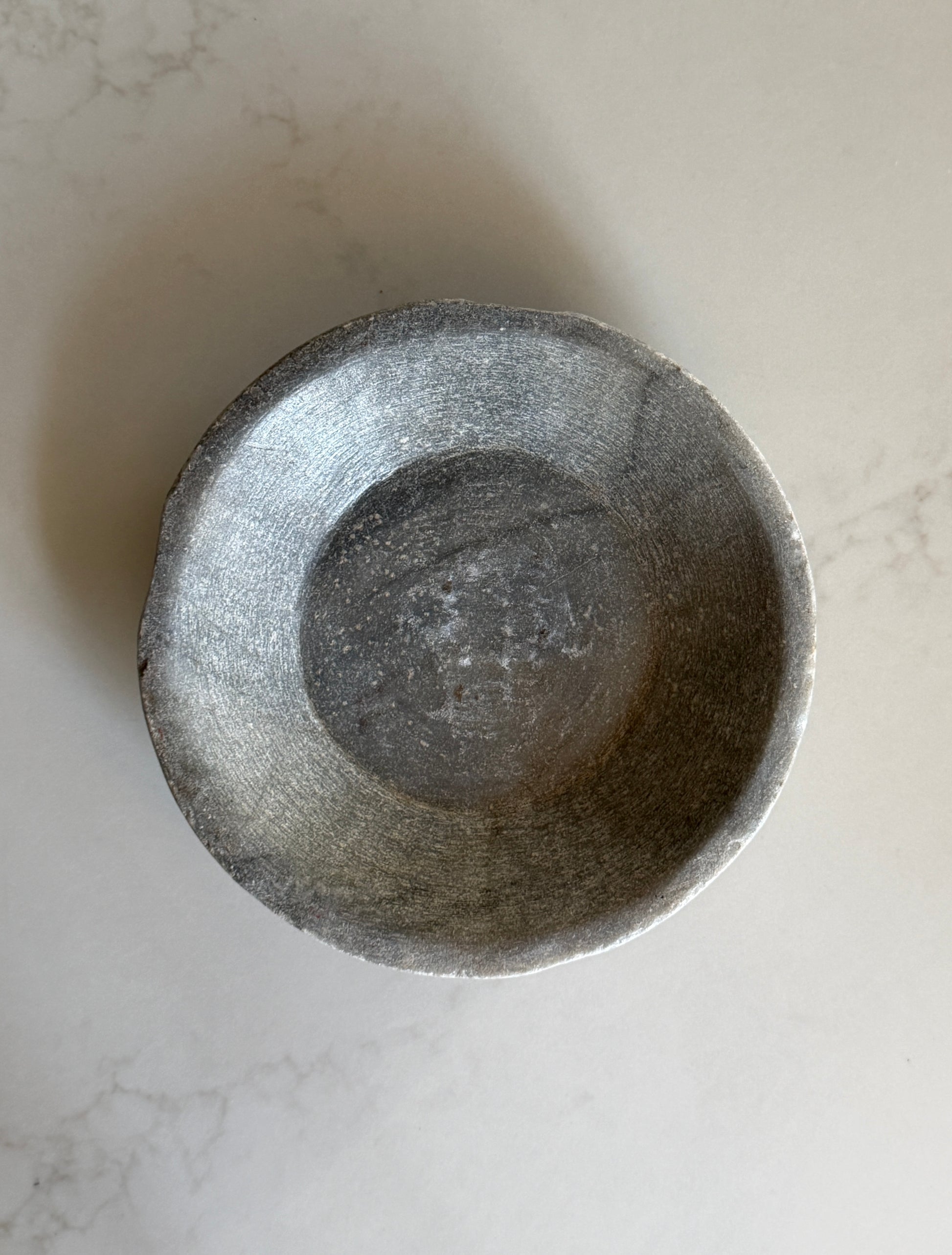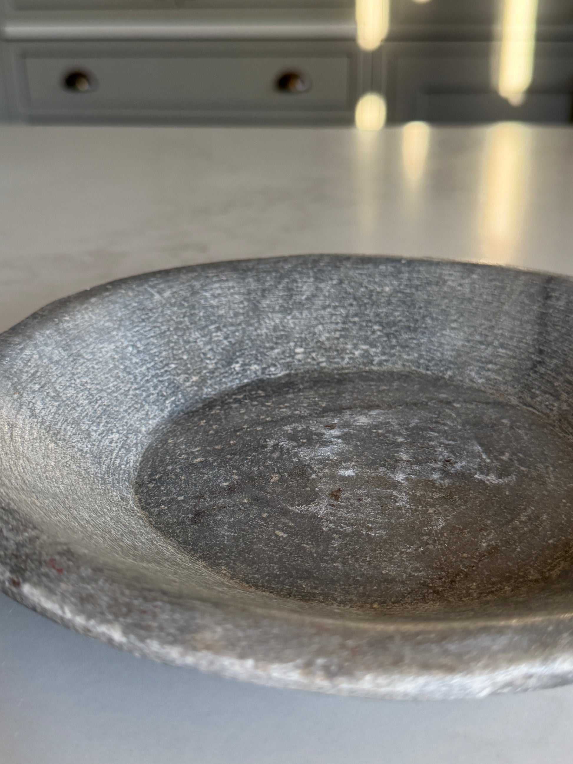 A beautifully rustic grey-toned aged marble plate, with natural patina and soft veining throughout. This is a lovely decorative piece for adding texture and layering to your shelves, or for housing a soap and brush by the kitchen or utility sink. In excellent antique condition.