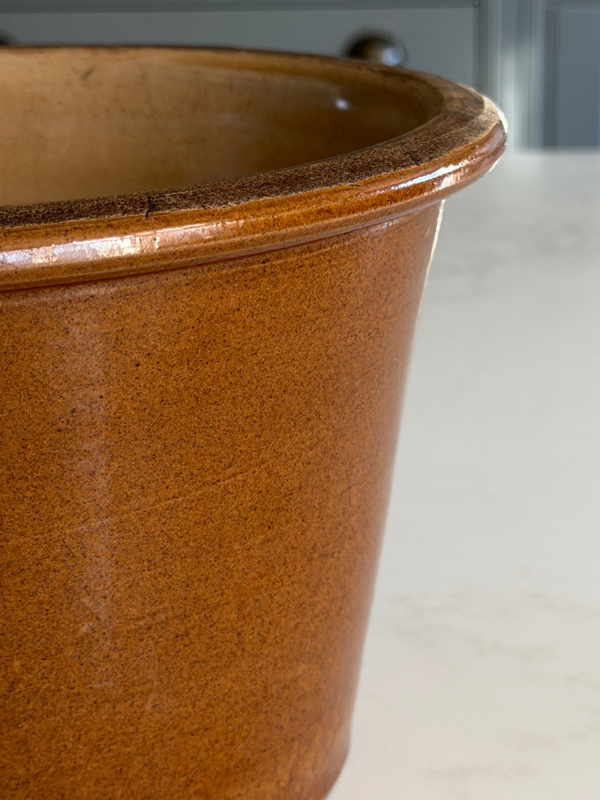 A medium-sized vintage baking bowl with a warm brown glaze. Functional and beautiful, this is a classic piece that brings a subtle country farmhouse feel to any kitchen.