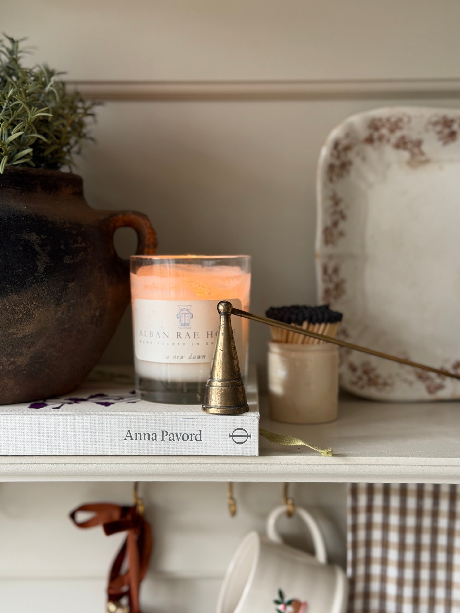 A beautiful brass candle wick snuffer with a long handle for safe use. This piece has a stunning naturally aged patina, and a simple and elegant bell-shaped design that offers the perfect blend of form and function. This candle snuffer would sit beautifully styled next to your chosen candle.
