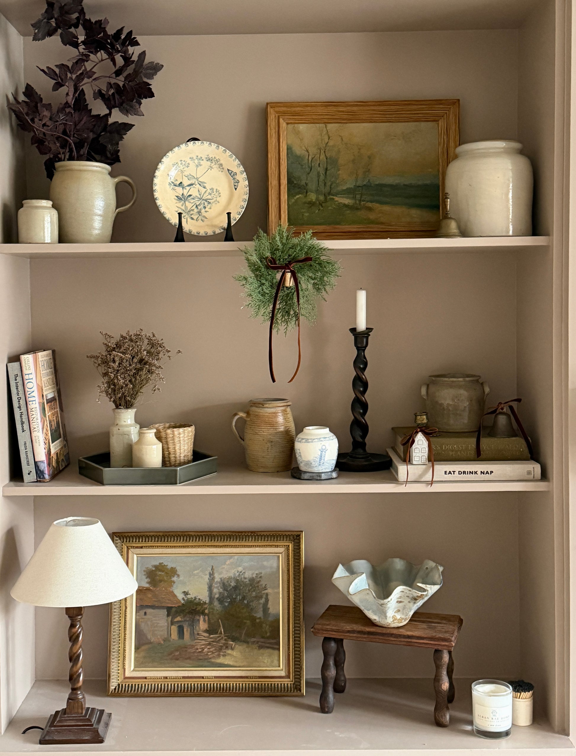 An original oil painting on canvas. The painting depicts a rural outdoor scene featuring a beautiful tree lined river with distant village buildings just visible. This piece has a stunning muted palette of greens, oranges, browns and blues, offering easy seasonal styling and a feel of nature in a timeless and layered interior. This piece is framed in a beautifull and elegant oak frame, that compliments the orange and brown tones of the piece, and make it a perfect addition to the home for autumn. This piece is in excellent antique condition.