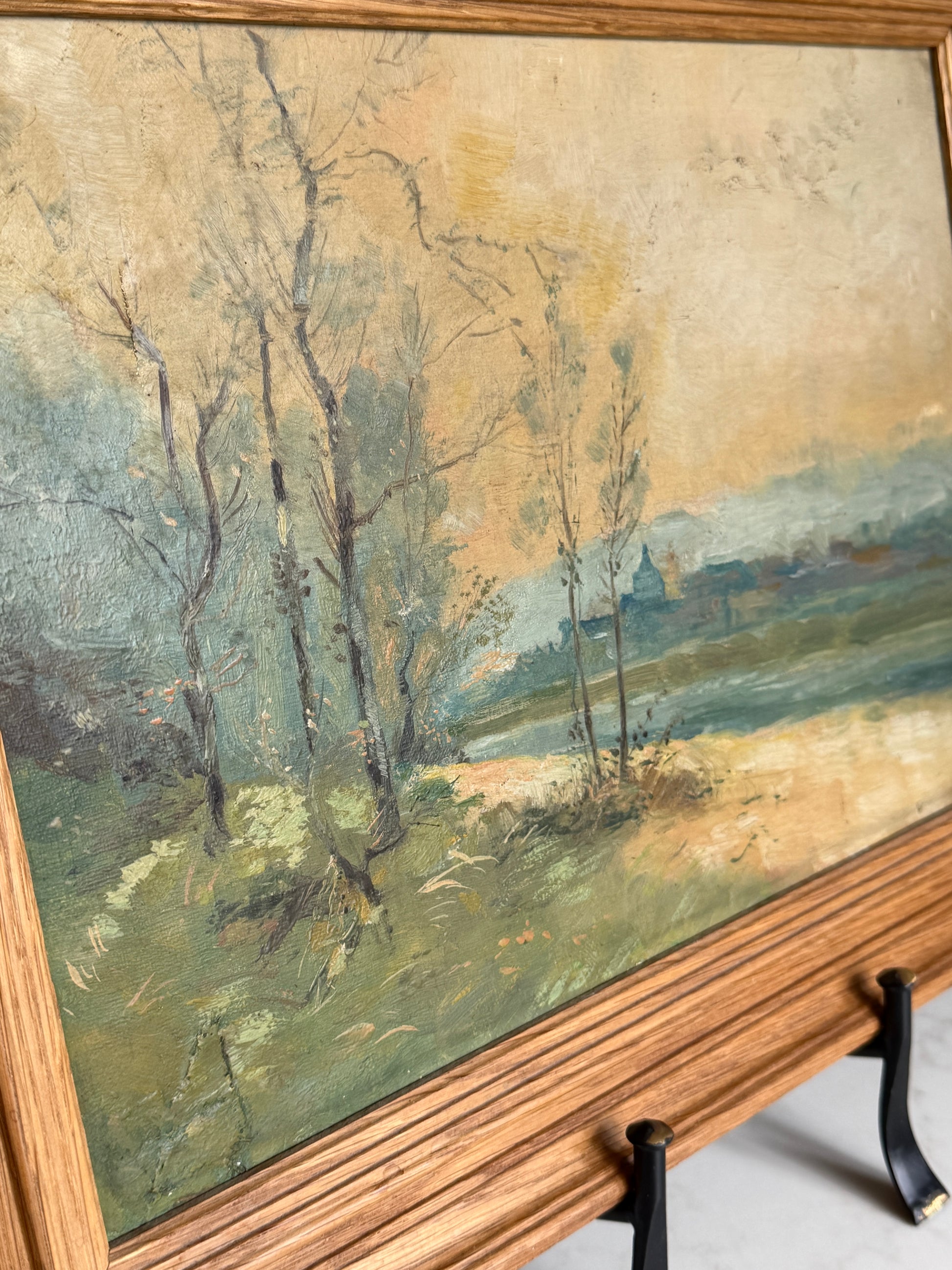French Oak Framed River Scene Landsape Oil Painting