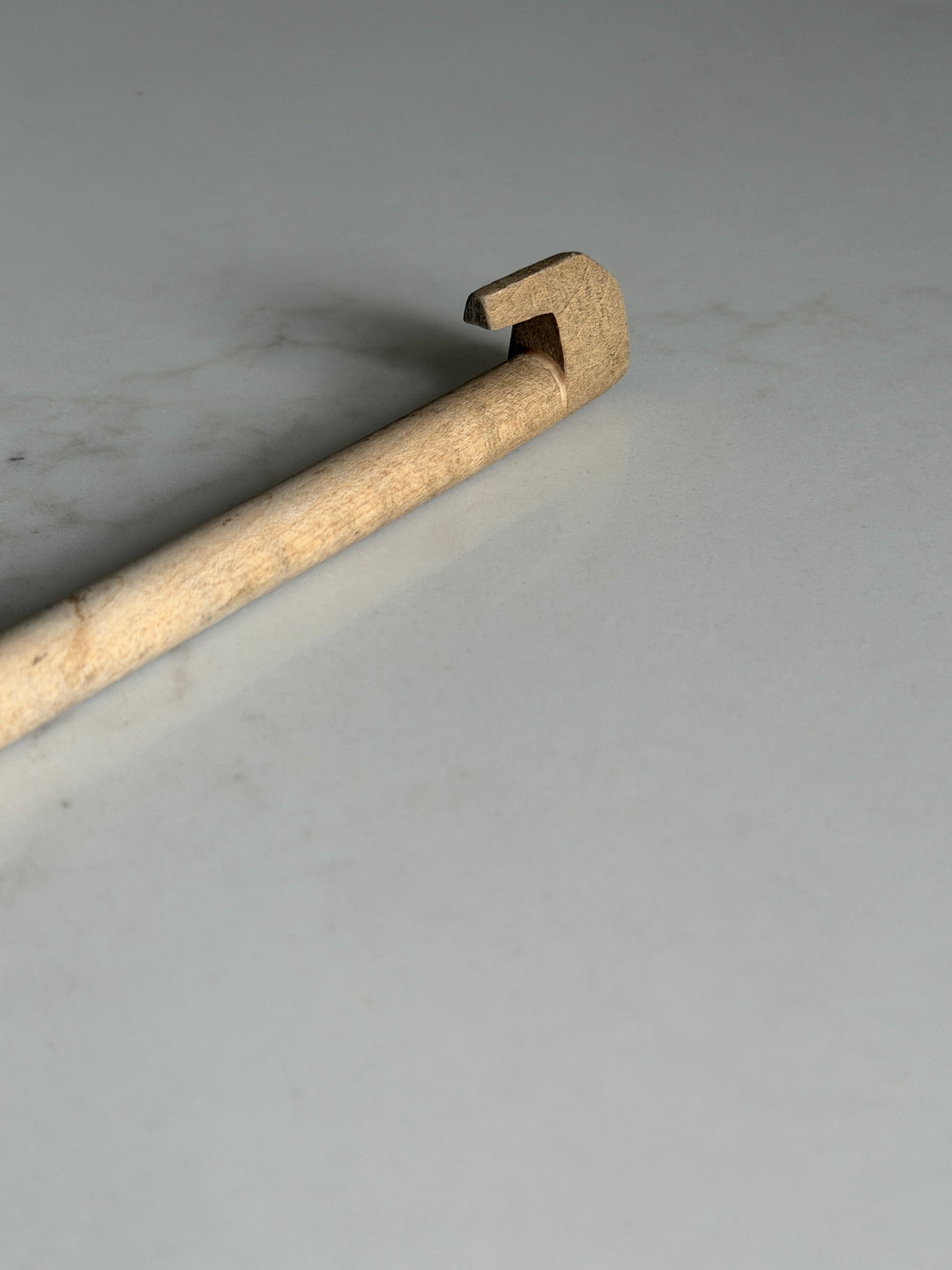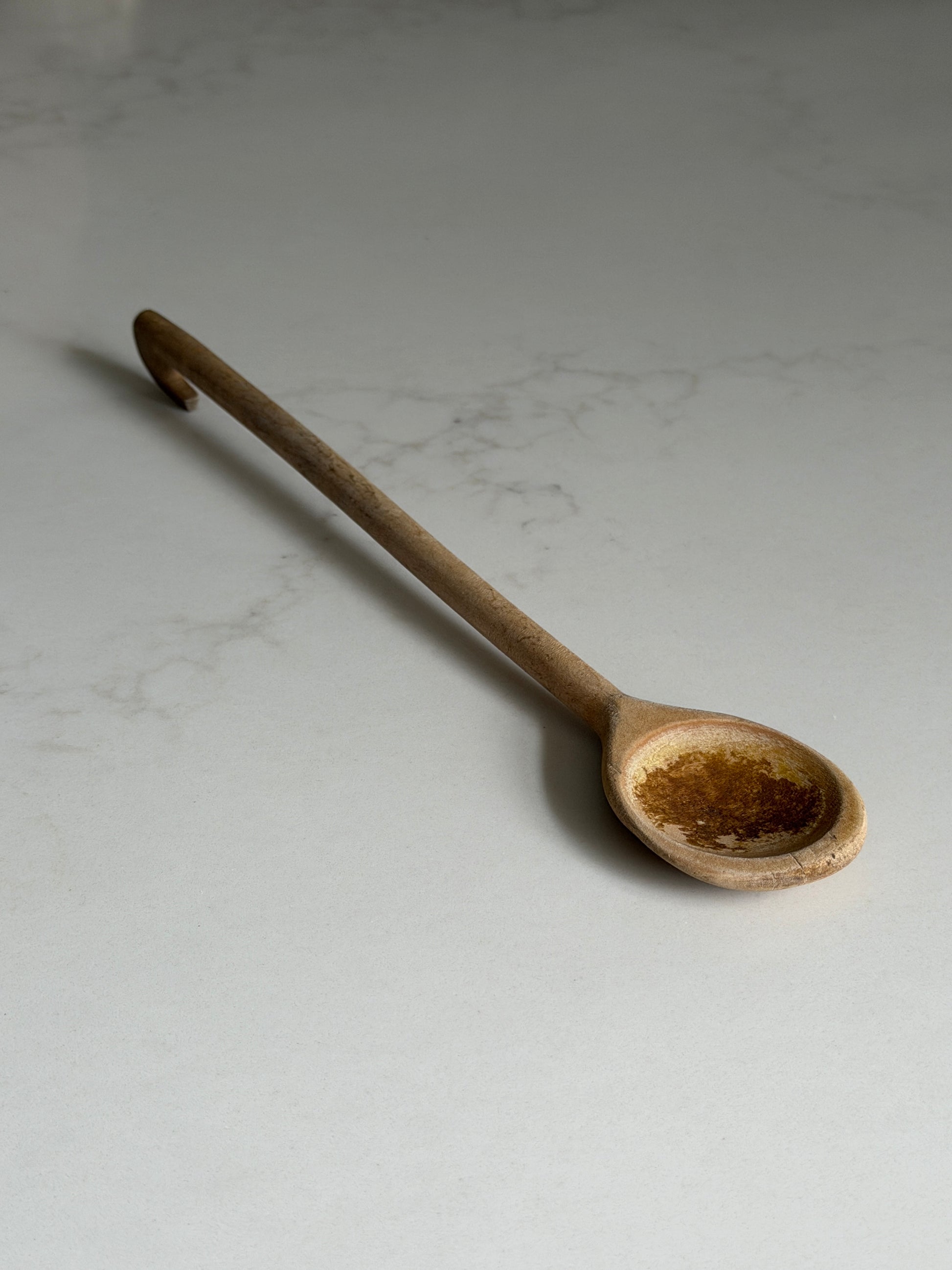 A vintage French solid wood spoon. Hand-carved and uniquely designed with a hook on the handle and a petite size, it is perfect for hanging on kitchen hooks.