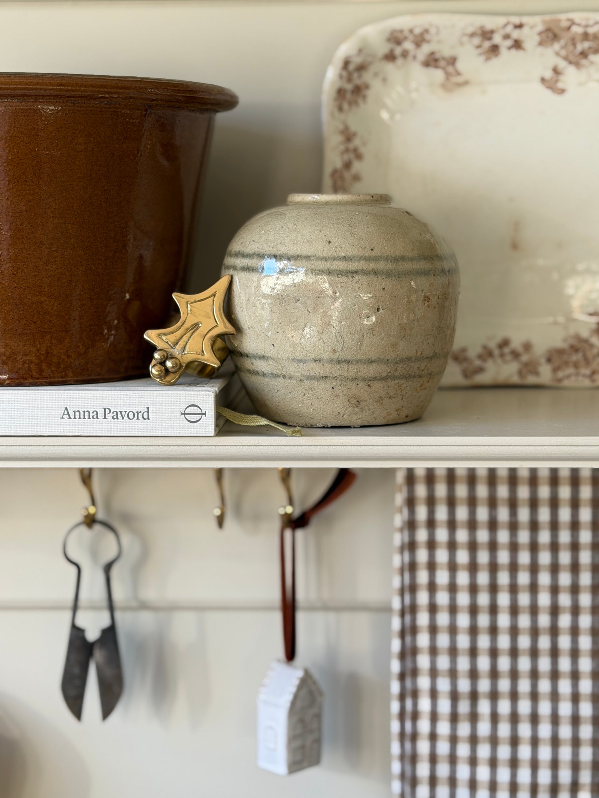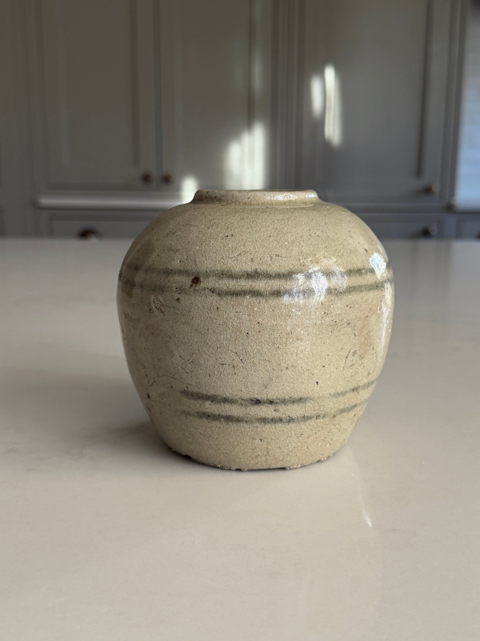A classic Chinese ginger jar full of texture and in beautiful earthy tones. This vessel is a beautiful warm beige shade, with a crackled glaze textured finish, and unique green banding. Full of character and offering versatile styling opportunities, this piece is the perfect addition to your timeless home decor collection. In excellent antique condition.