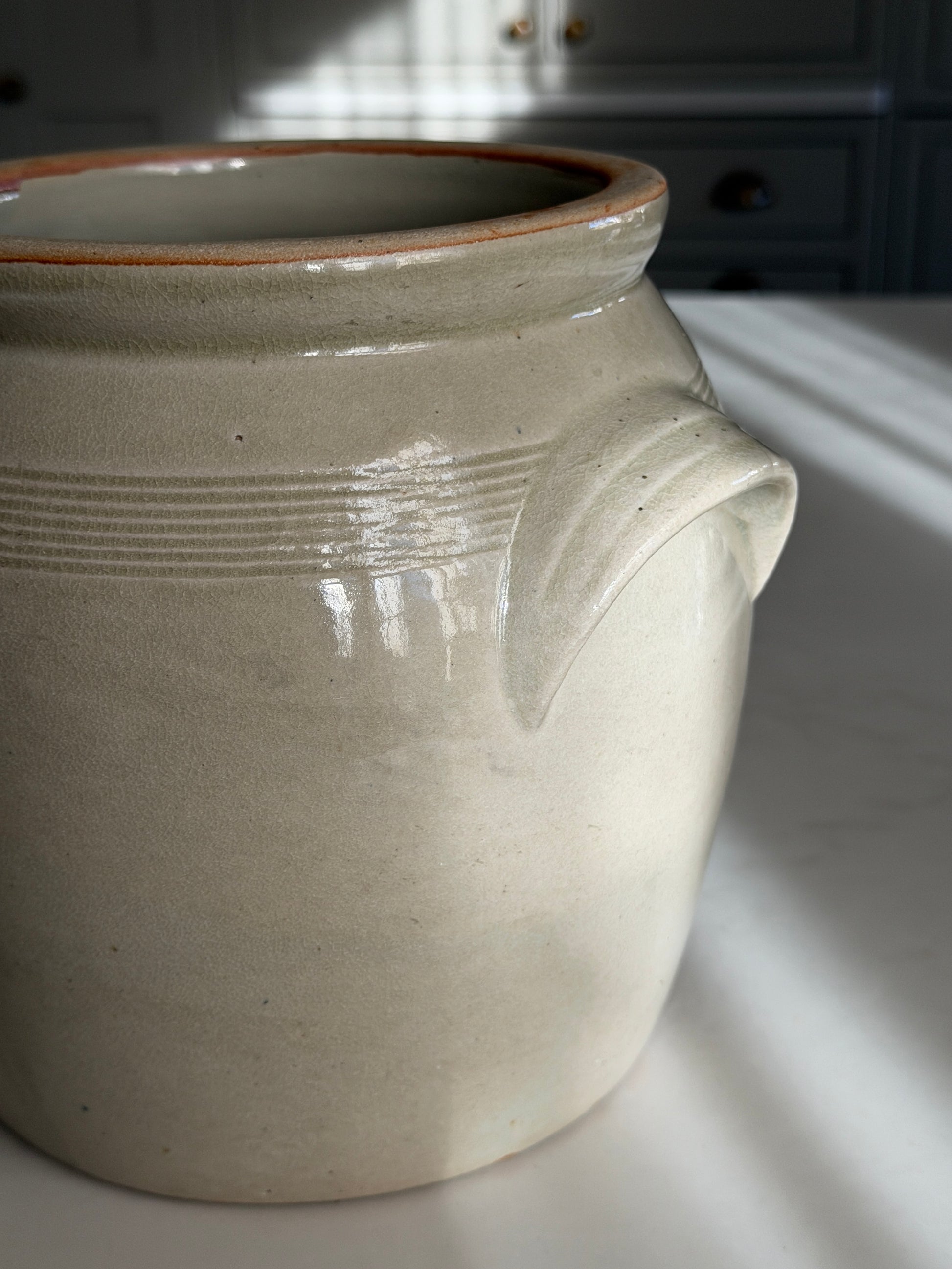 A classic French confit pot featuring twin side handles and a unique green-grey toned glaze. This confit pot has a timeless look, with crackling to the glaze that adds character to both rustic and modern interiors.