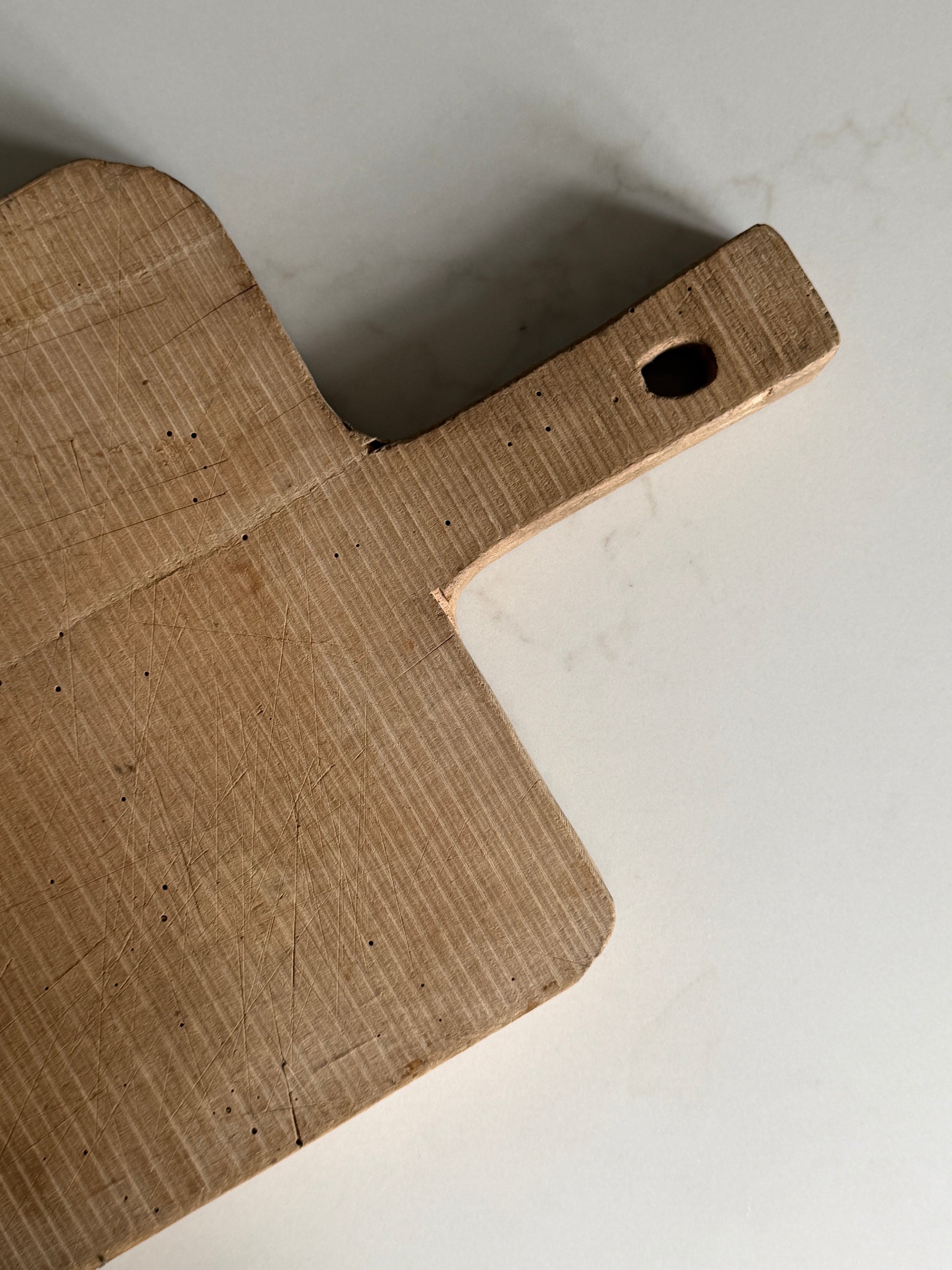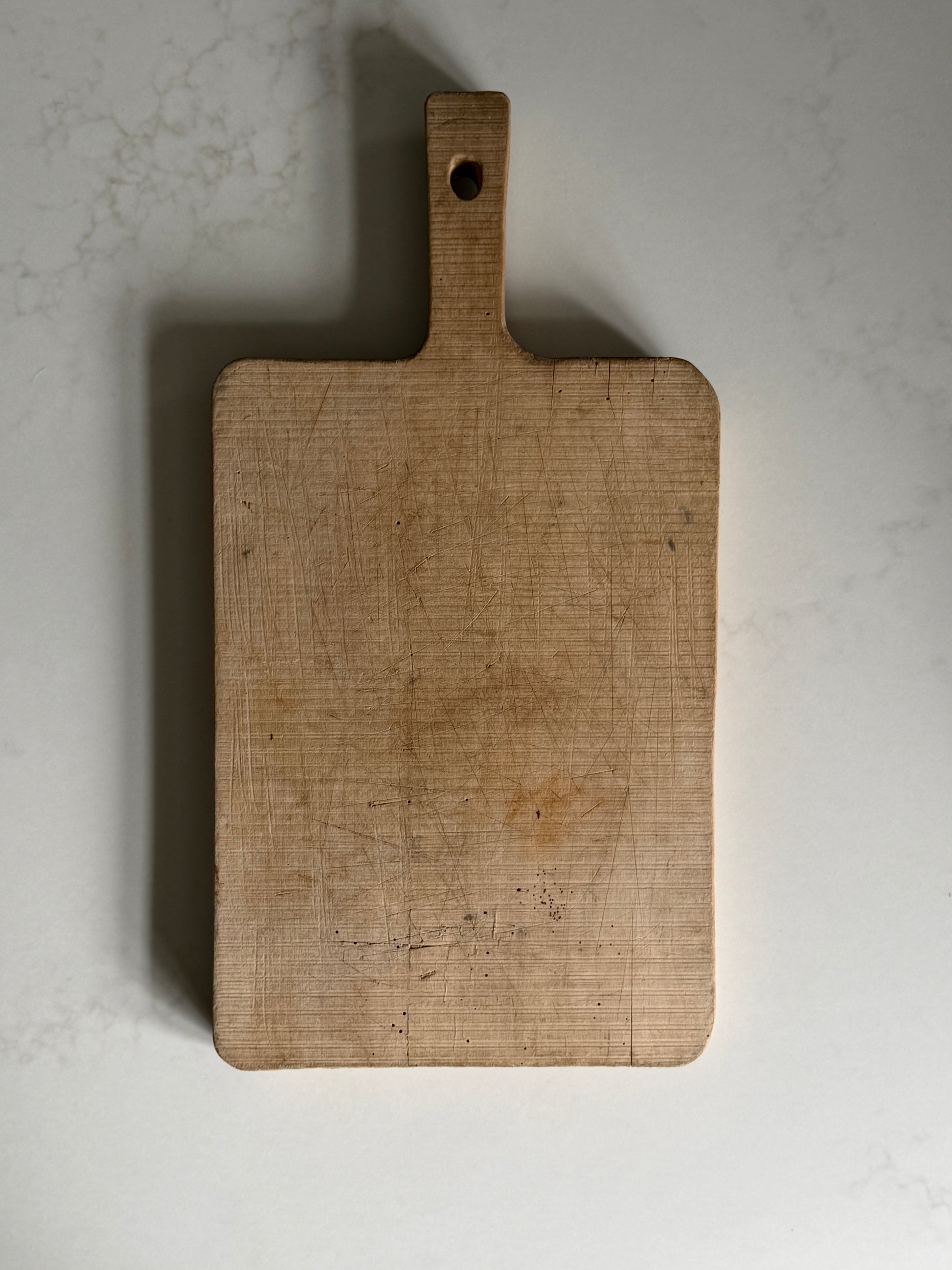 A solid wood vintage chopping board with a rectangular shape, rounded edges, and a simple handle with hanging hole. The tone and grain of the wood have aged beautifully, with surface markings that reflect its history and use over time.