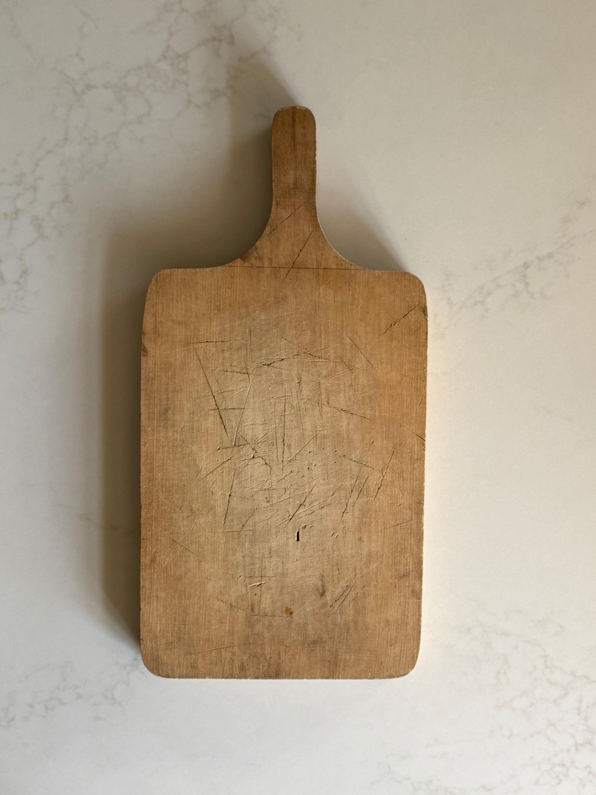 A solid wood vintage chopping board with a rectangular shape, rounded edges, and a simple handle. The tone and grain of the wood have aged beautifully, with surface markings that reflect its history and use over time.