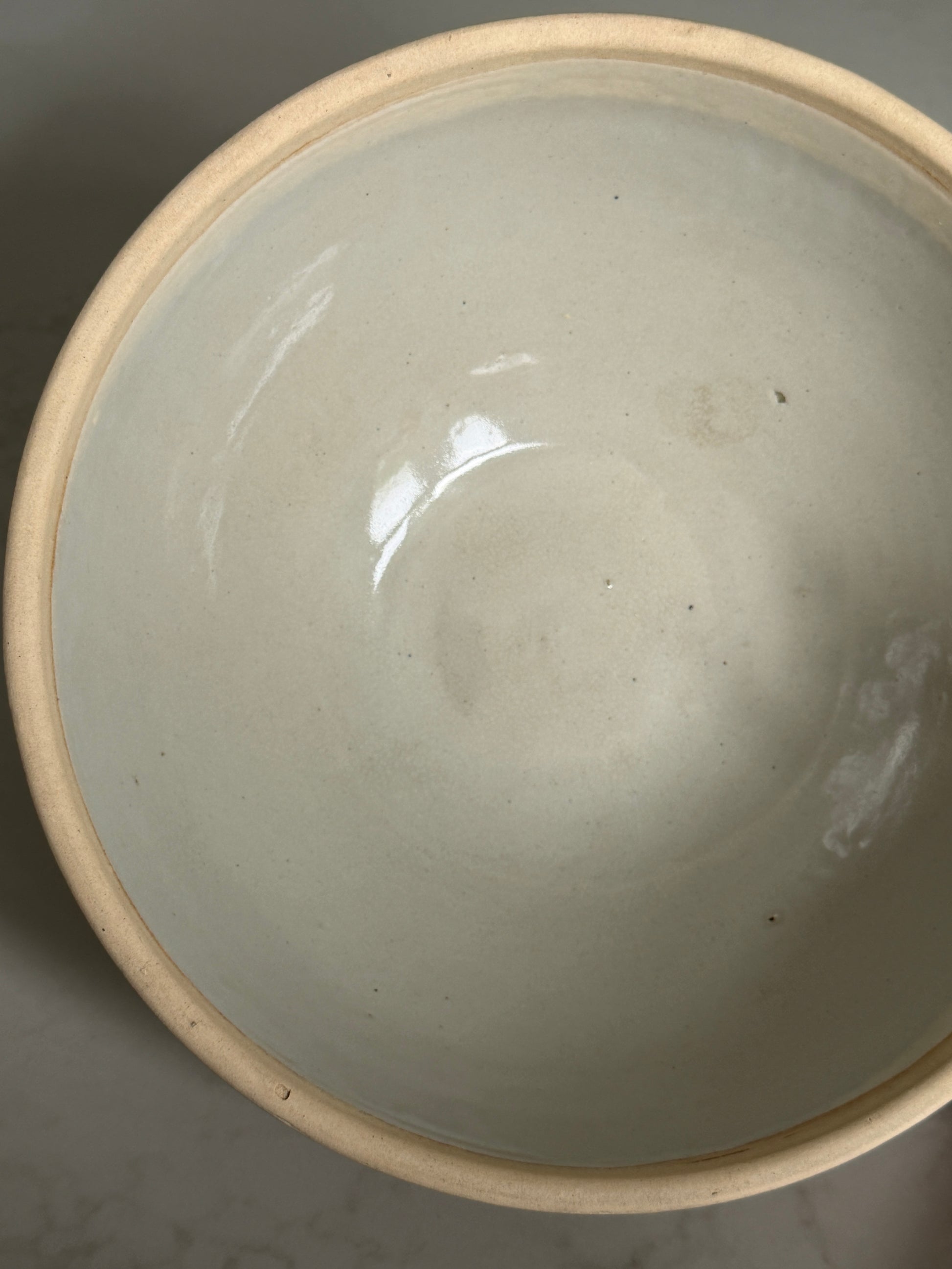 A large vintage French baking bowl in a soft off-white with a striking half-glazed finish, giving it beautiful contrast and texture.