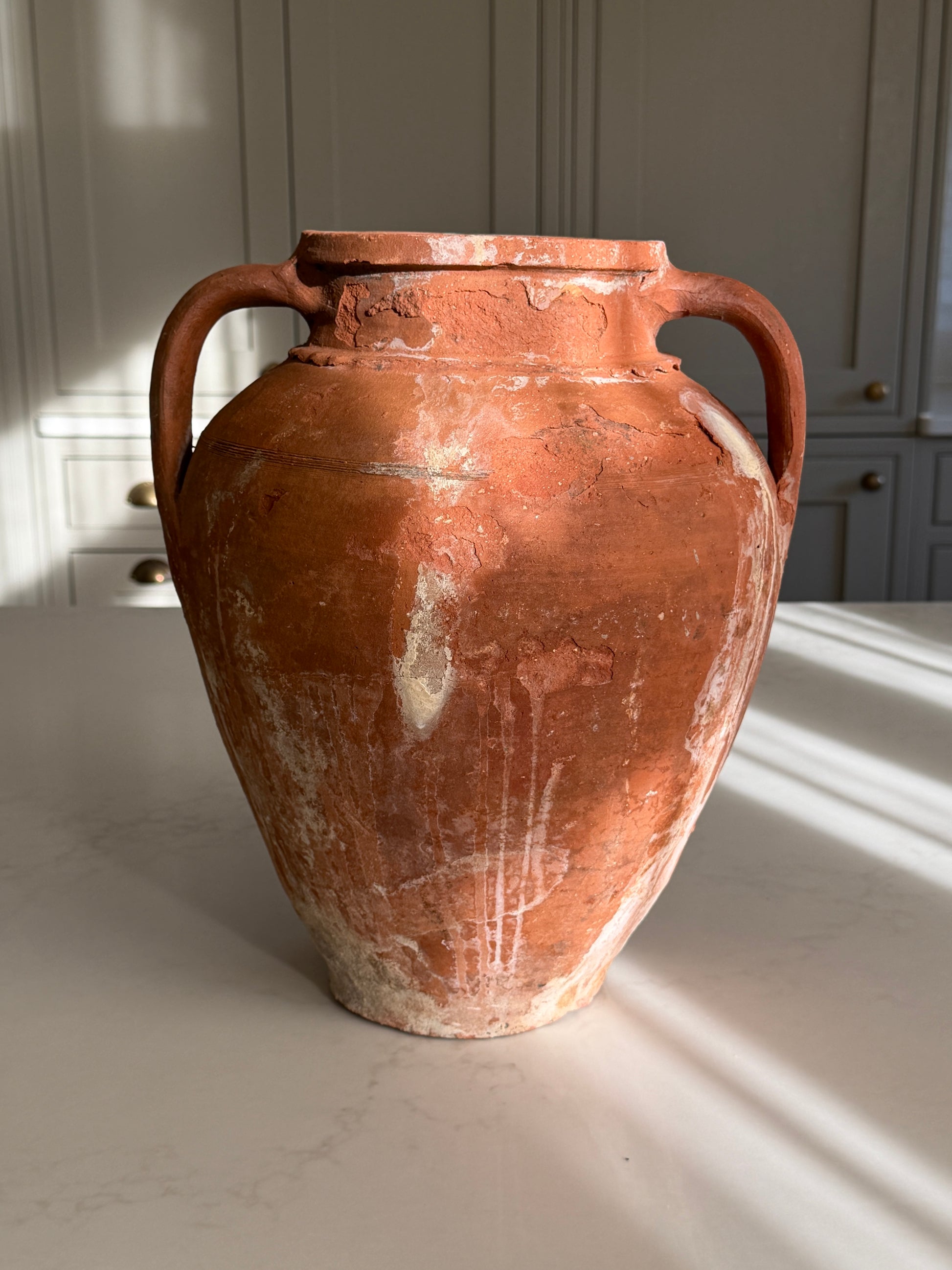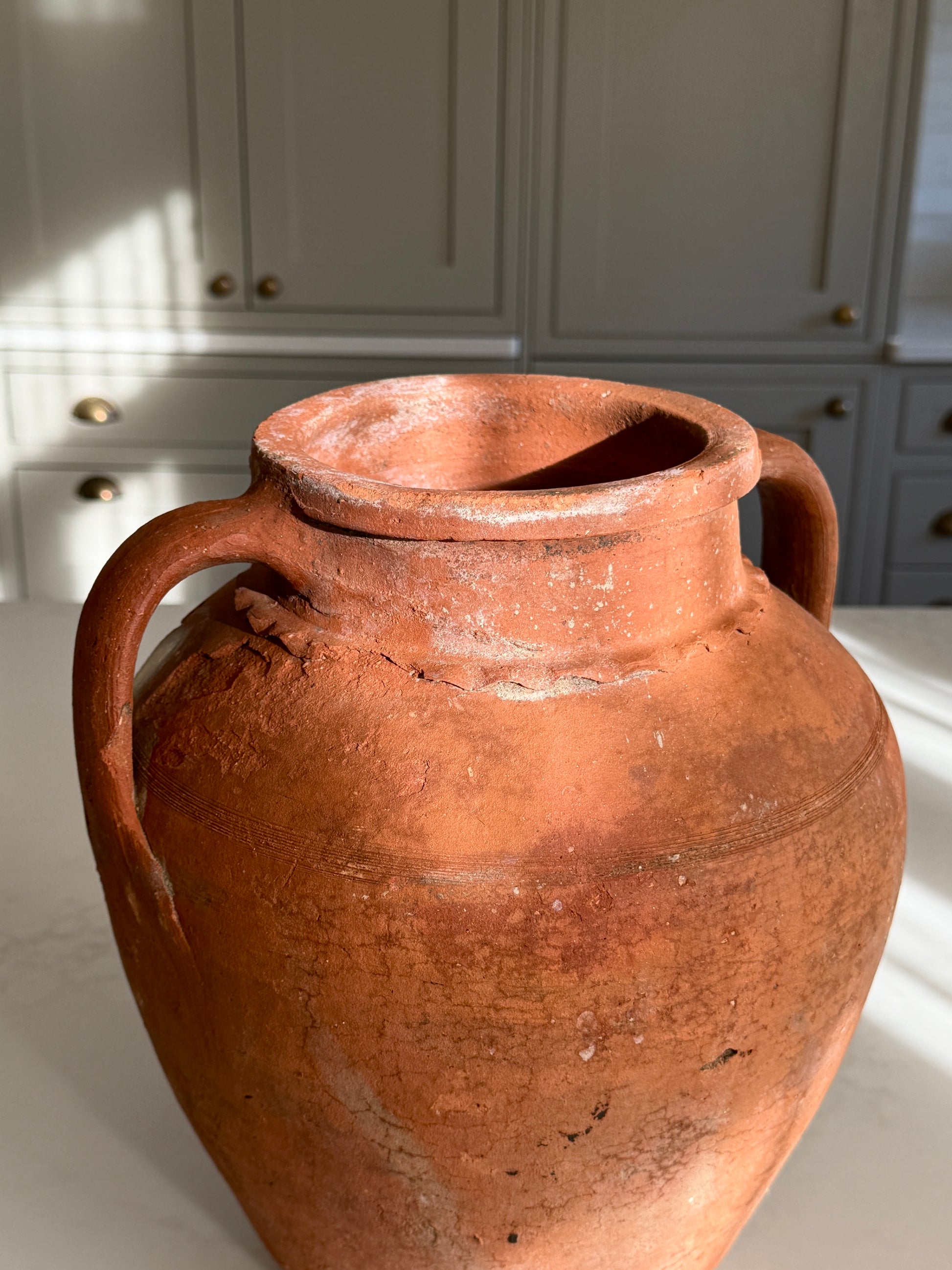 This large Turkish terracotta pot brings rustic character and organic texture to any space. With two classic loop handles and distinctive scalloped detailing around the neck, its handcrafted form and aged patina speak to its history. There is visible wear, including some chips and marks, all which enhance its character and interest.