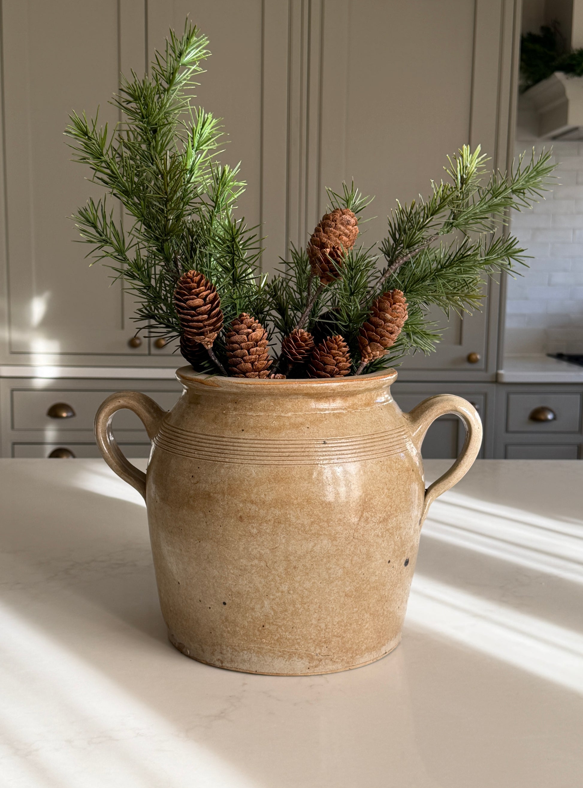 Its generous size makes it perfect for branches or seasonal stem displays, though it looks lovely styled on its own too. These loop-handled ones are harder to find, especially with such a unique glaze and finish.