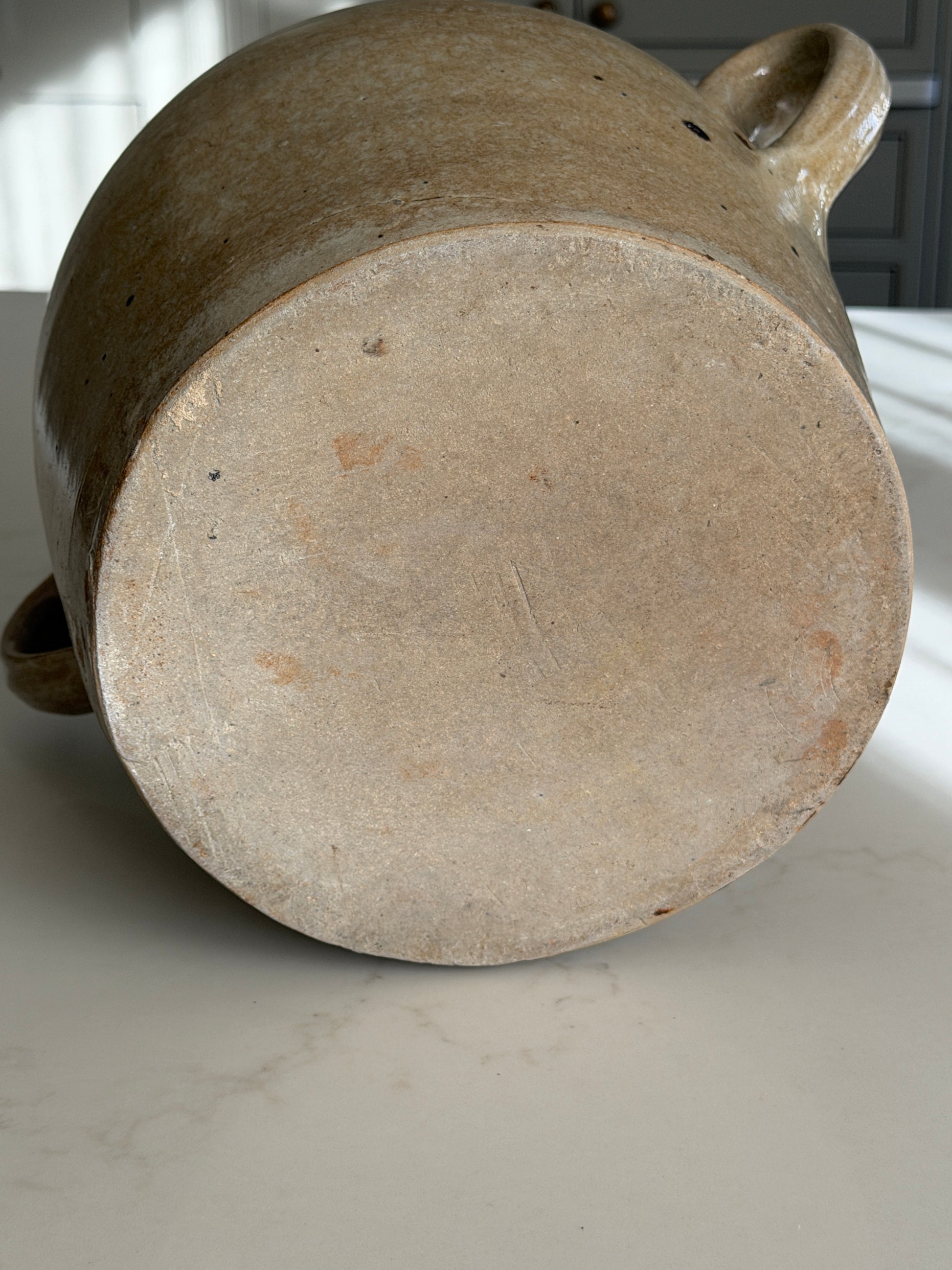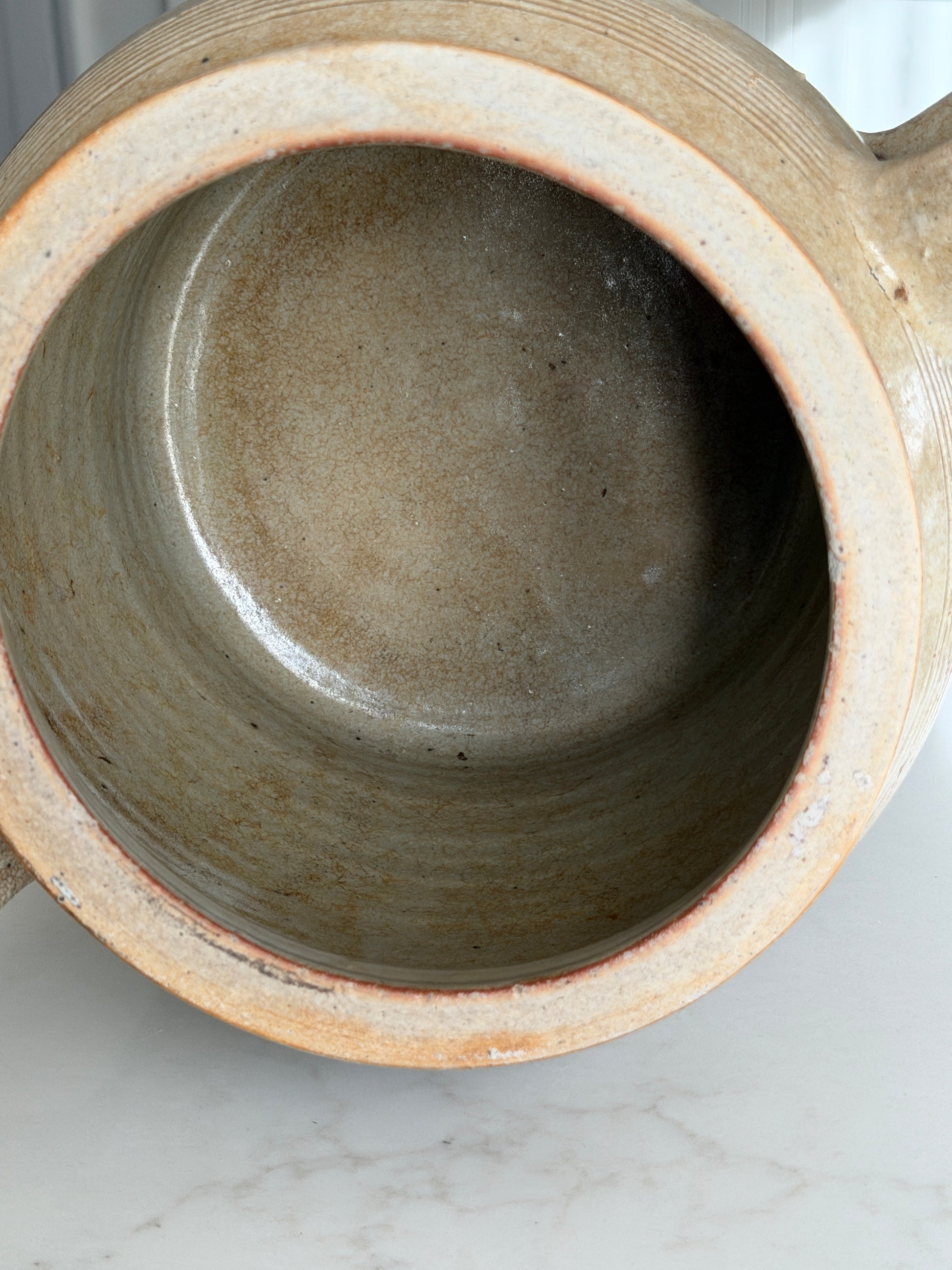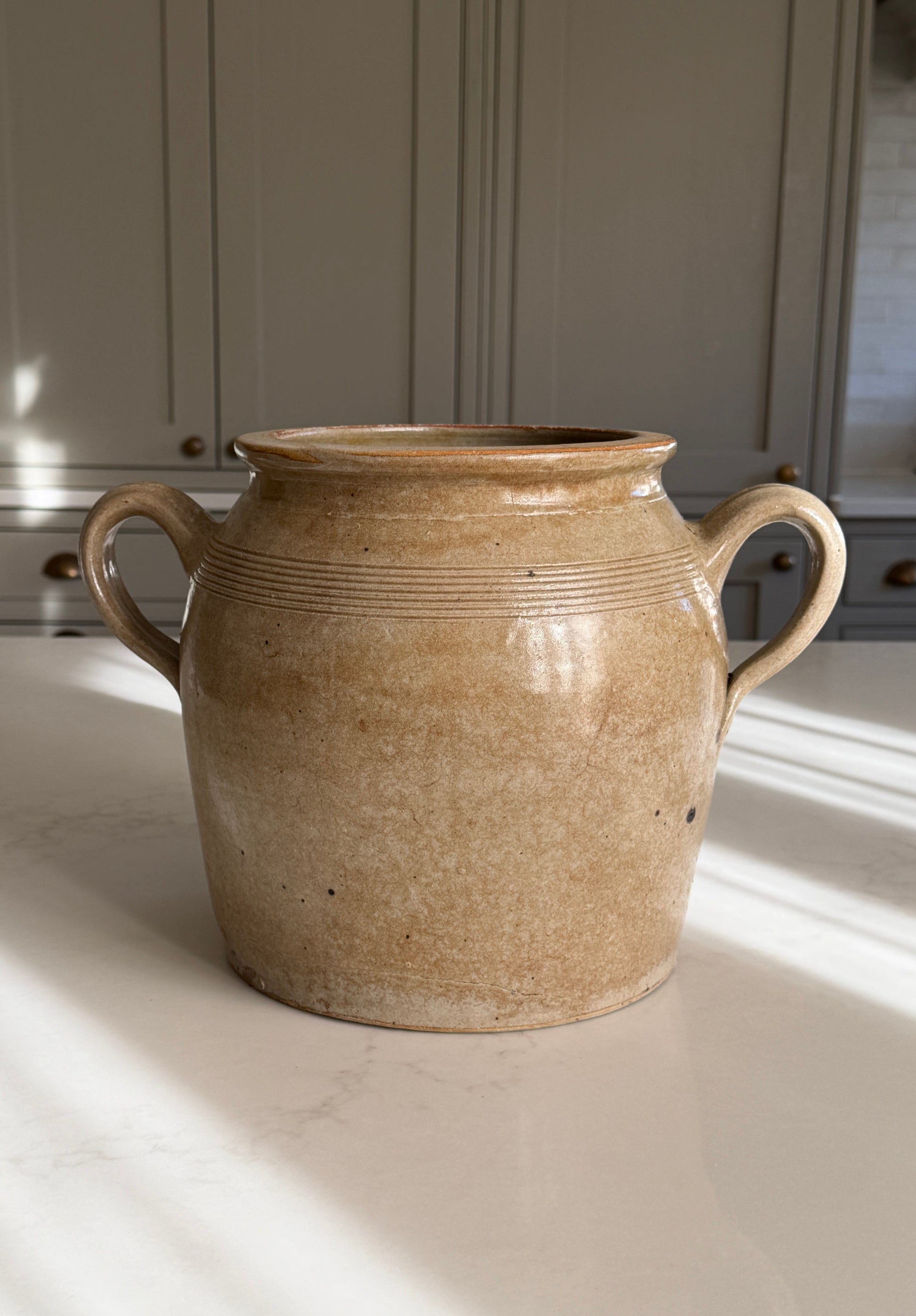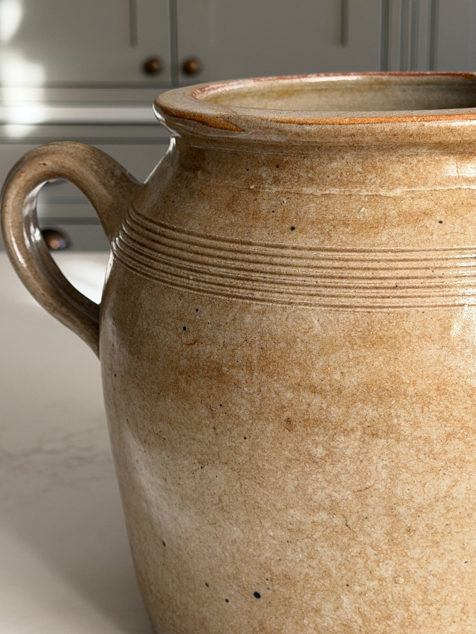 A beautiful old French confit pot with a soft mottled caramel glaze and loop handles.