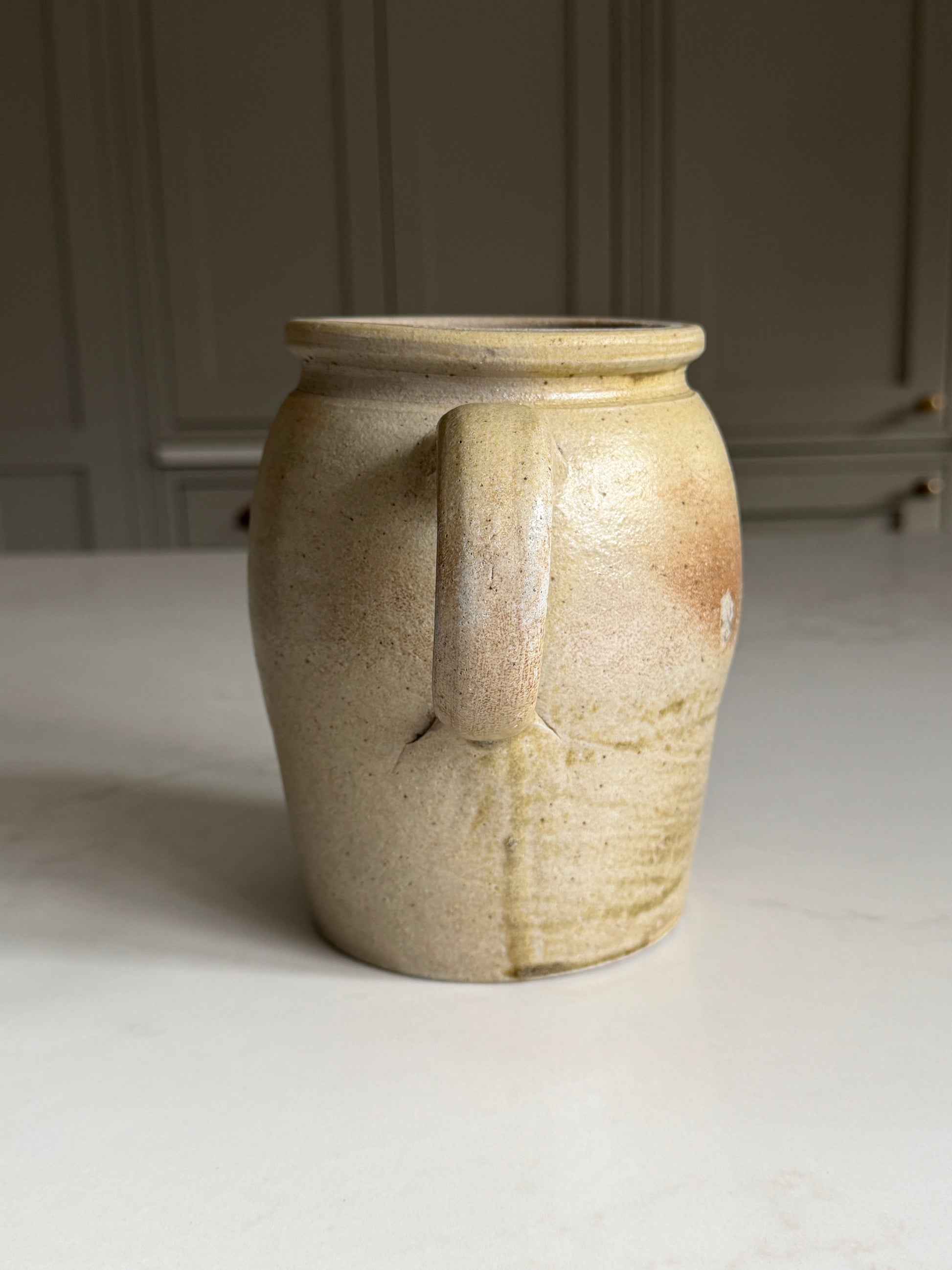 A medium-sized French confit pot with a single handle and earthy tones. The glaze finish has natural variation on each side, allowing for versatile styling and a truly unique and beautiful piece. Originally used for preserving food, it now makes a timeless decorative piece, ideal for styling on shelves or with floral stems in. This confit is in excellent antique condition, with some wear that add to its character.
