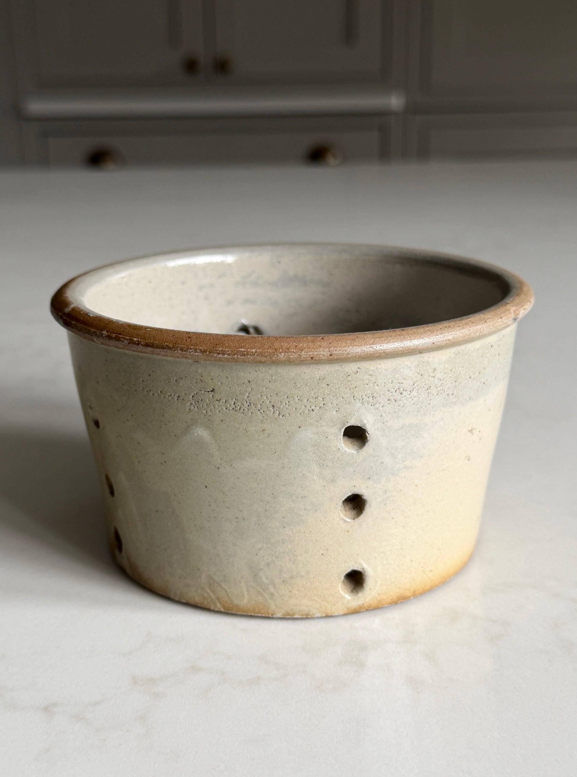 A medium-sized antique French cheesestrainer with a beautiful mix of green, grey, and beige tones. The glaze has natural variation throughout, giving the piece a textured, one-of-a-kind appearance.