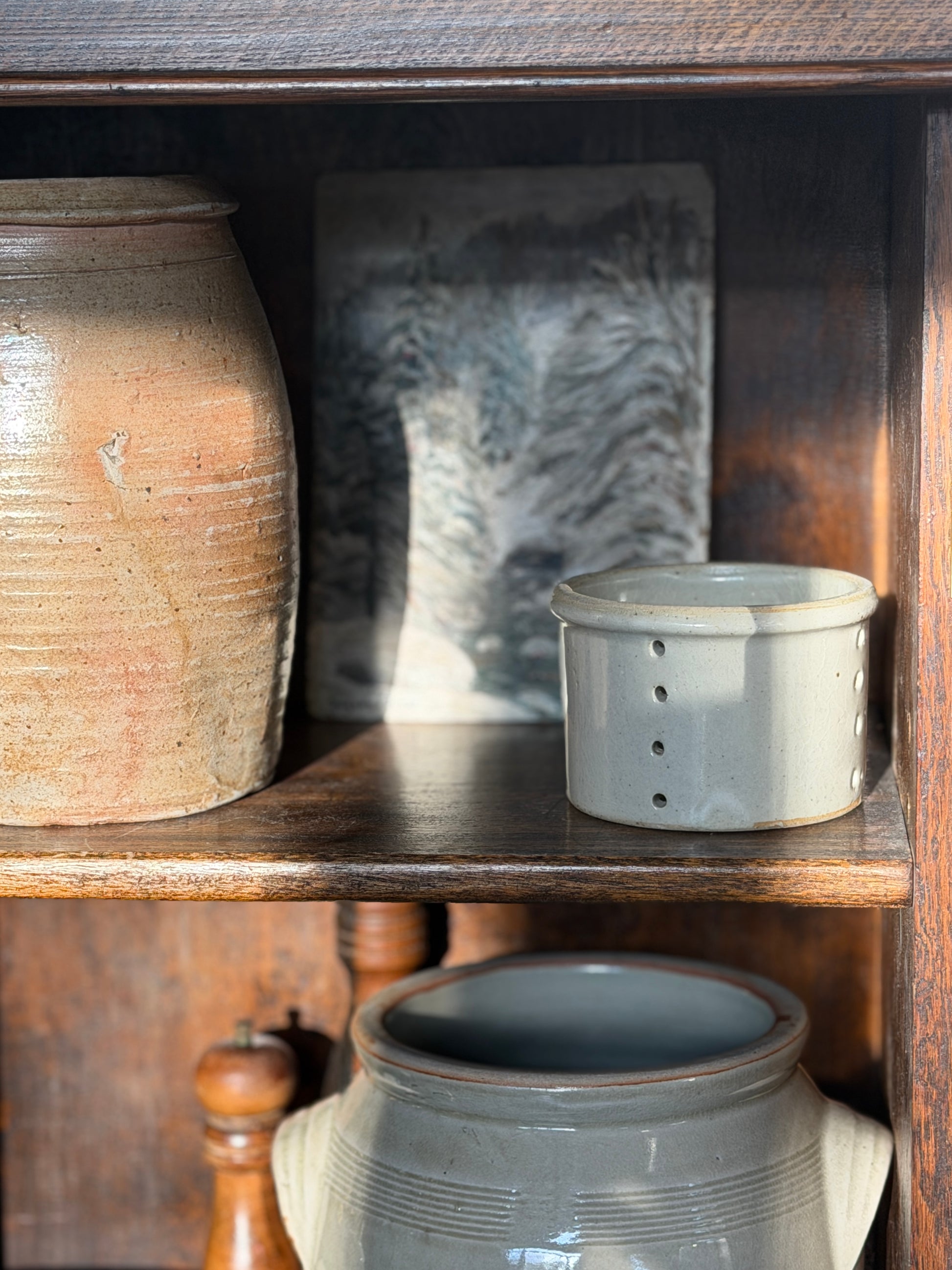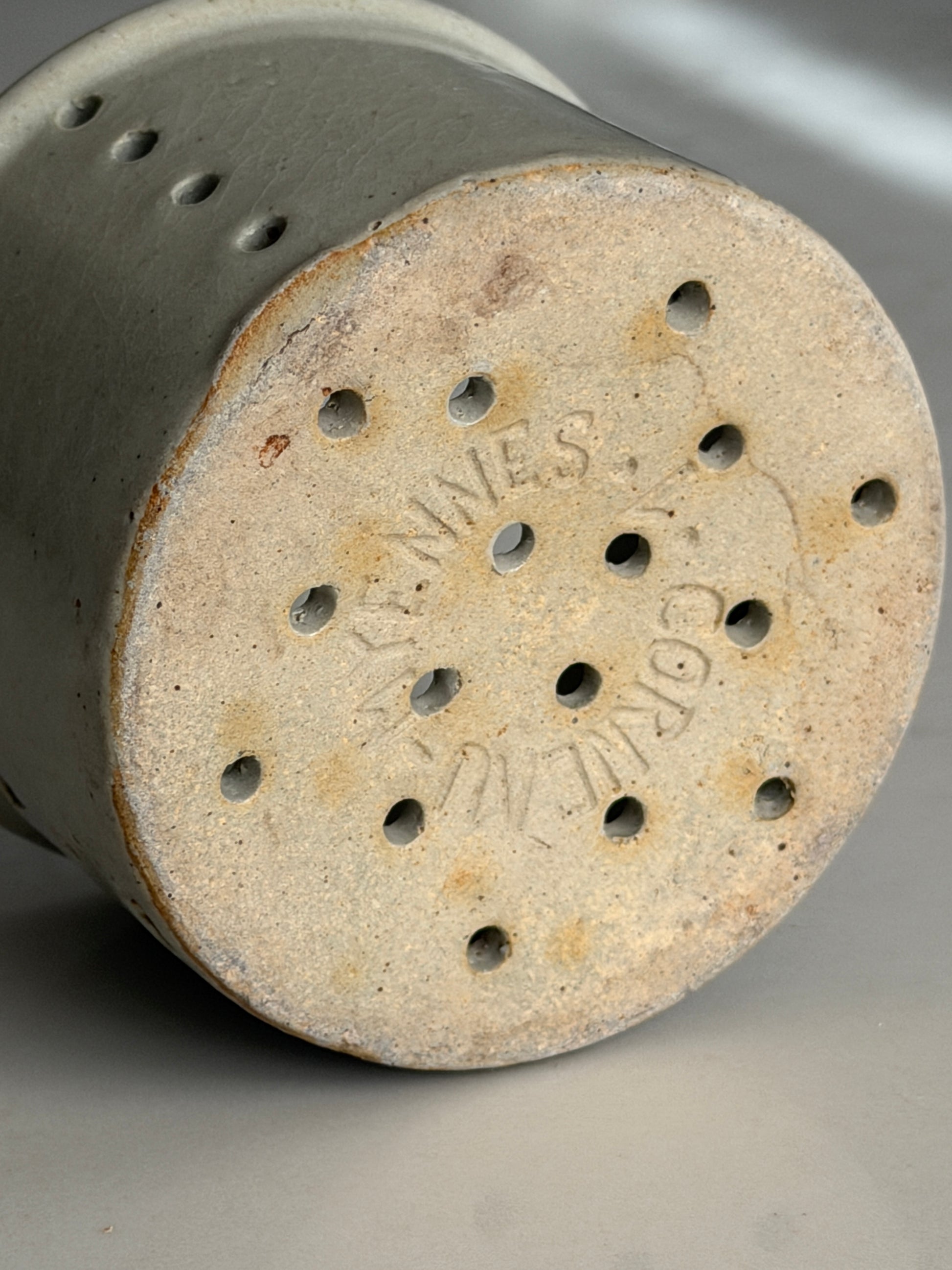 A medium-sized French cheese-strainer with a beautiful grey-greige tone. The glaze has a beautiful crackled finish, giving the piece a textured, one-of-a-kind appearance.