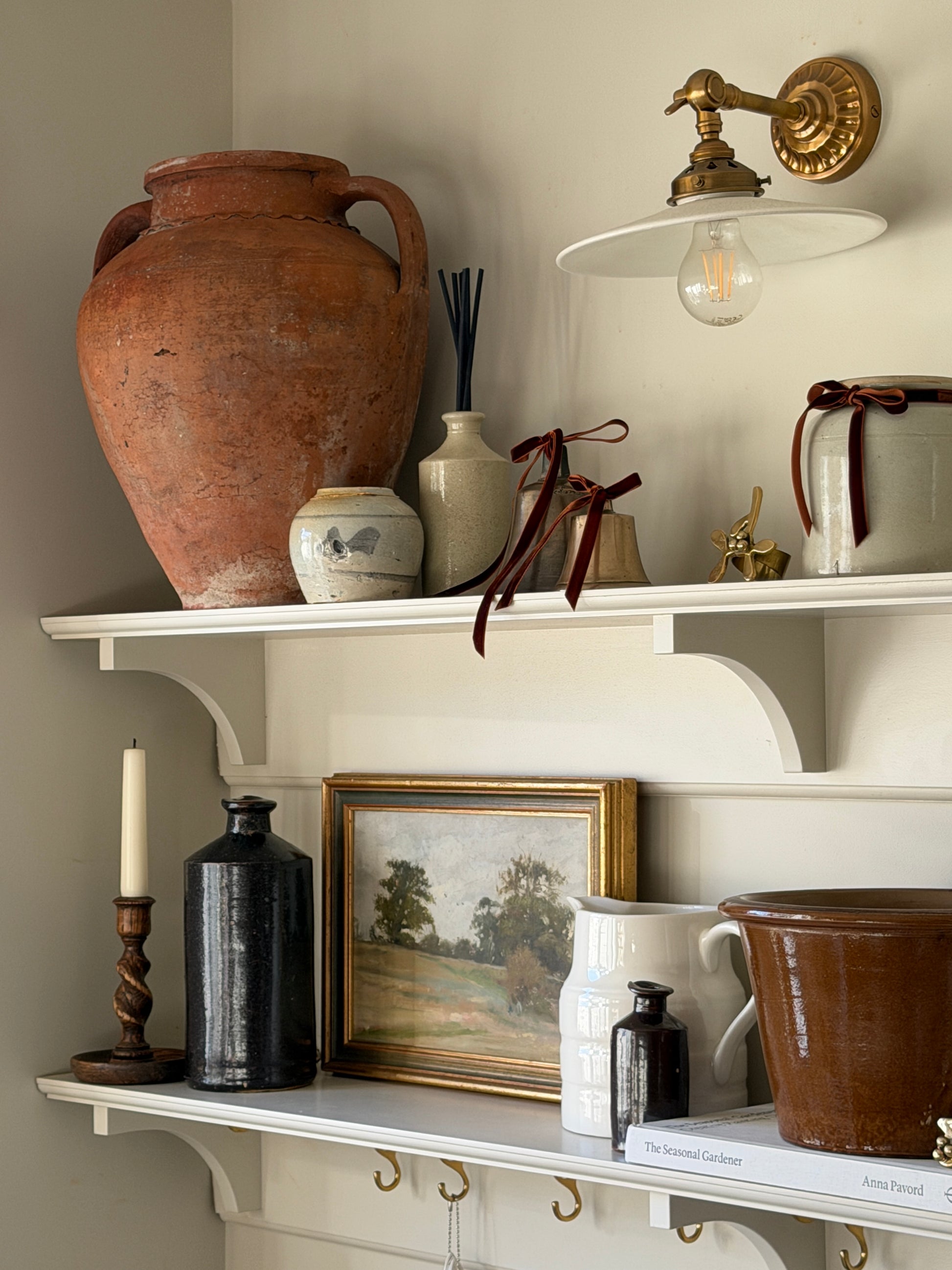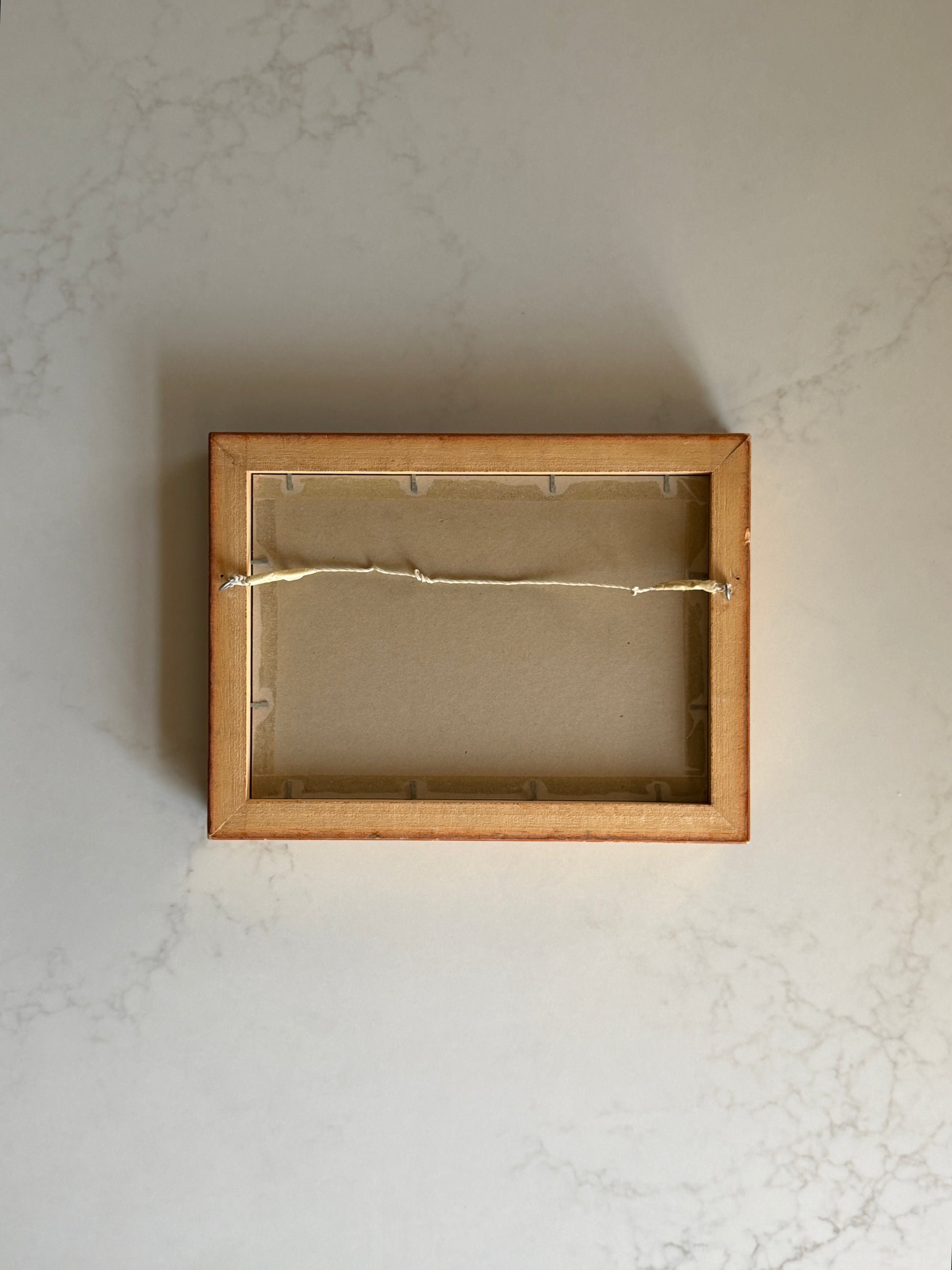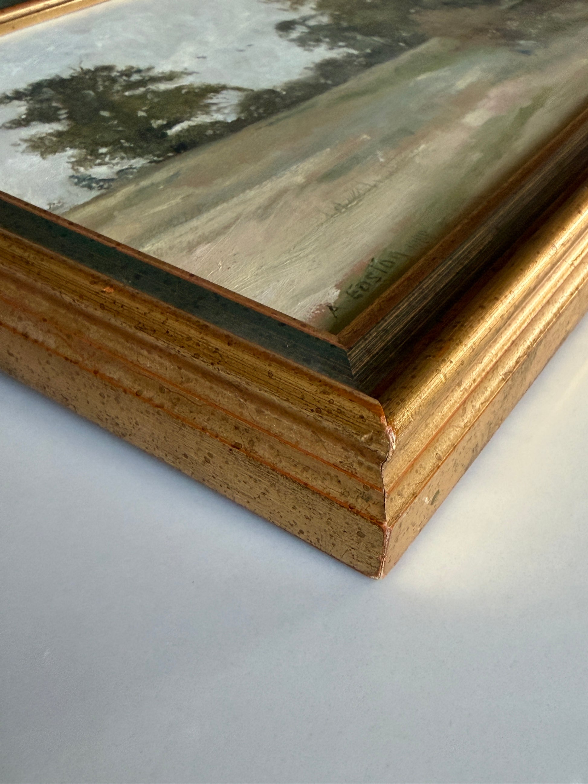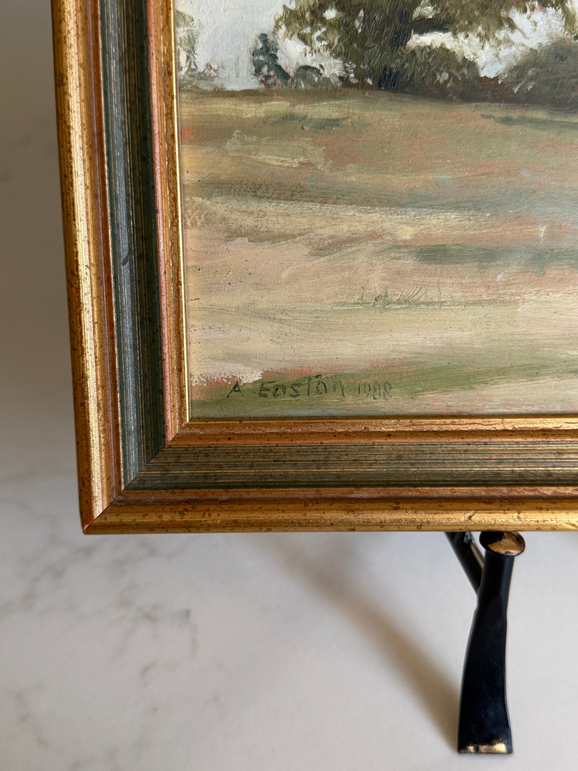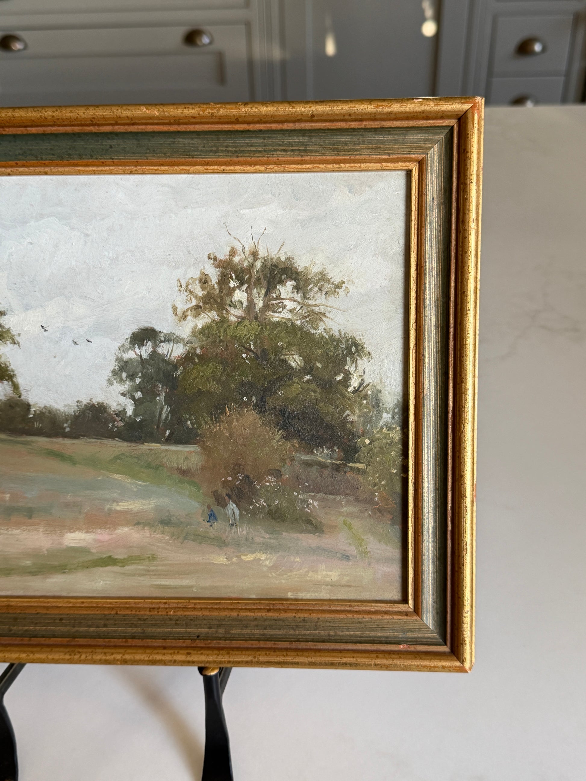 A signed and framed oil painting of a rural field and tree landscape, with calming earthy green tones. It’s set in a beautiful gold and green wooden frame that complements the palette perfectly. A neutral, versatile piece for layering on shelving, adding to a gallery wall, or styling as a feature on its own. In excellent vintage condition.