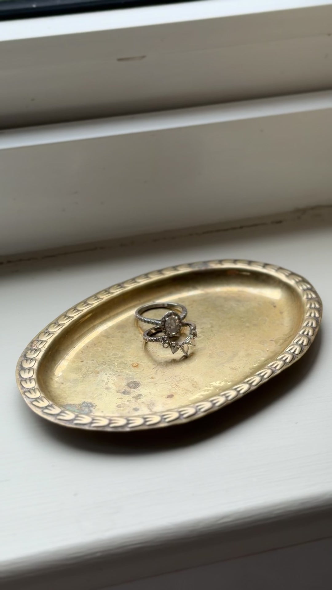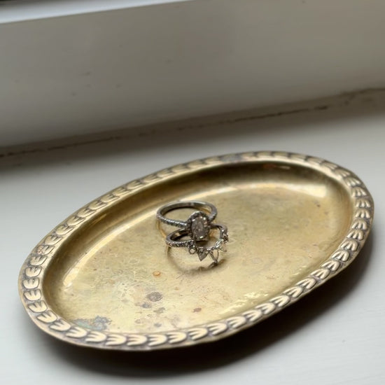 A small vintage brass trinket tray with a delicate raised floral embossed border and beautiful aged patina. Compact in size, it’s perfect for keeping jewellery or small essentials close to hand.
