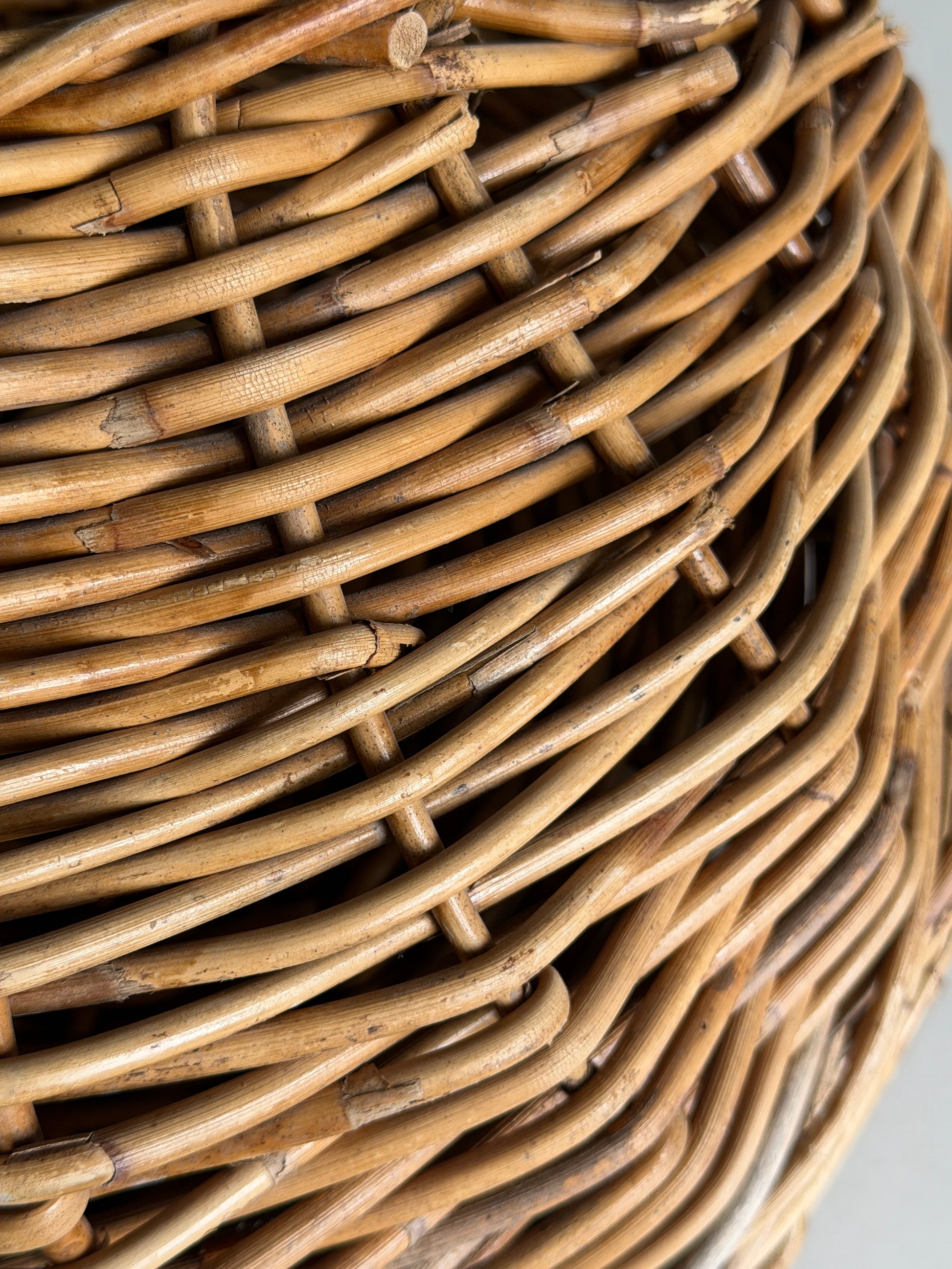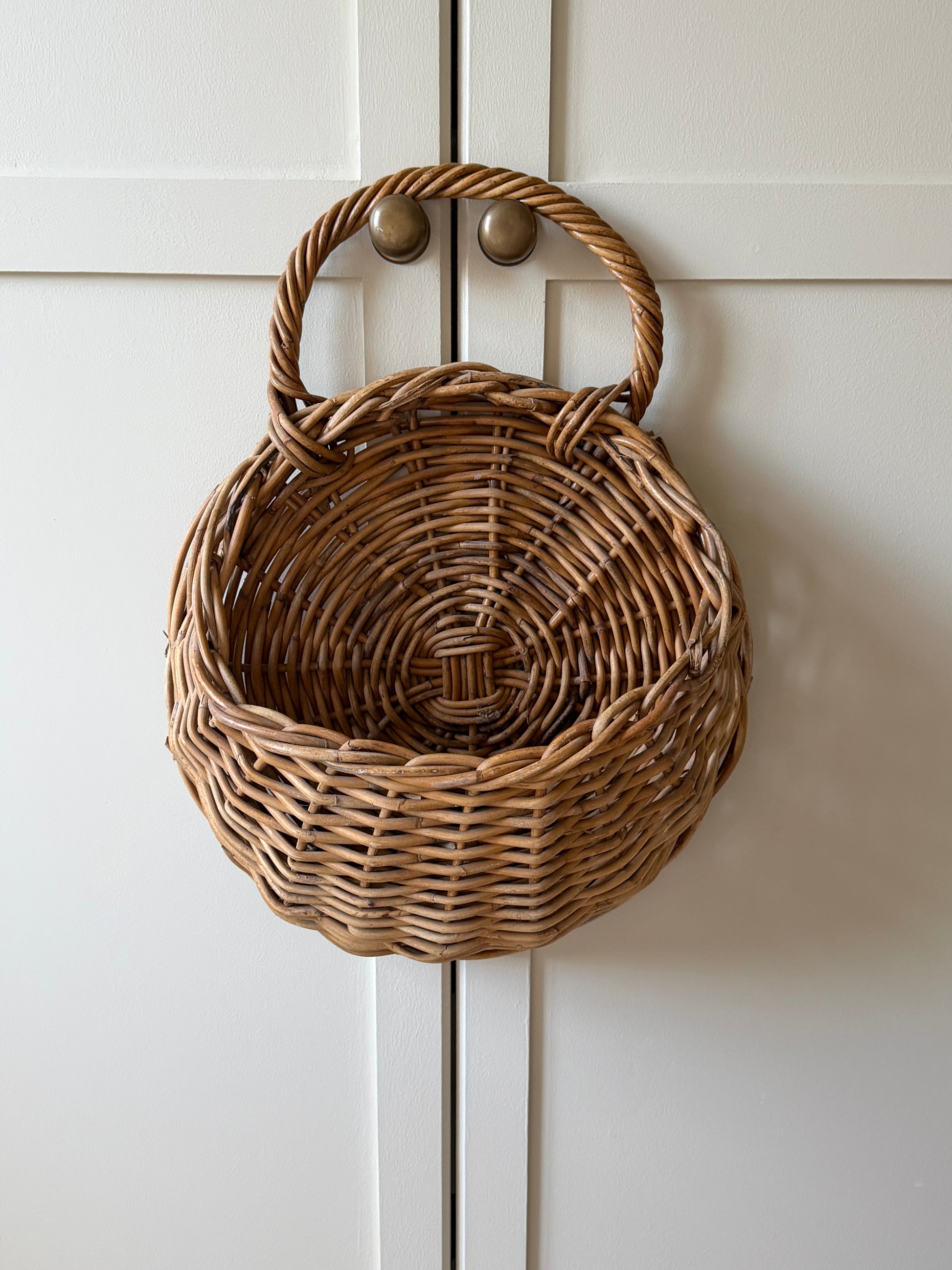 A wonderfully sturdy wall-hung wicker basket, it's unusually generous size makes it all the more unique and special. Designed to hang from a hook, it brings instant texture and warmth to any corner of your home. A practical yet beautiful storage solution. The woven detailing and curved handle make this a standout piece with timeless, rustic character. In excellent vintage condition, with signs of wear and patina that speak to its history.
