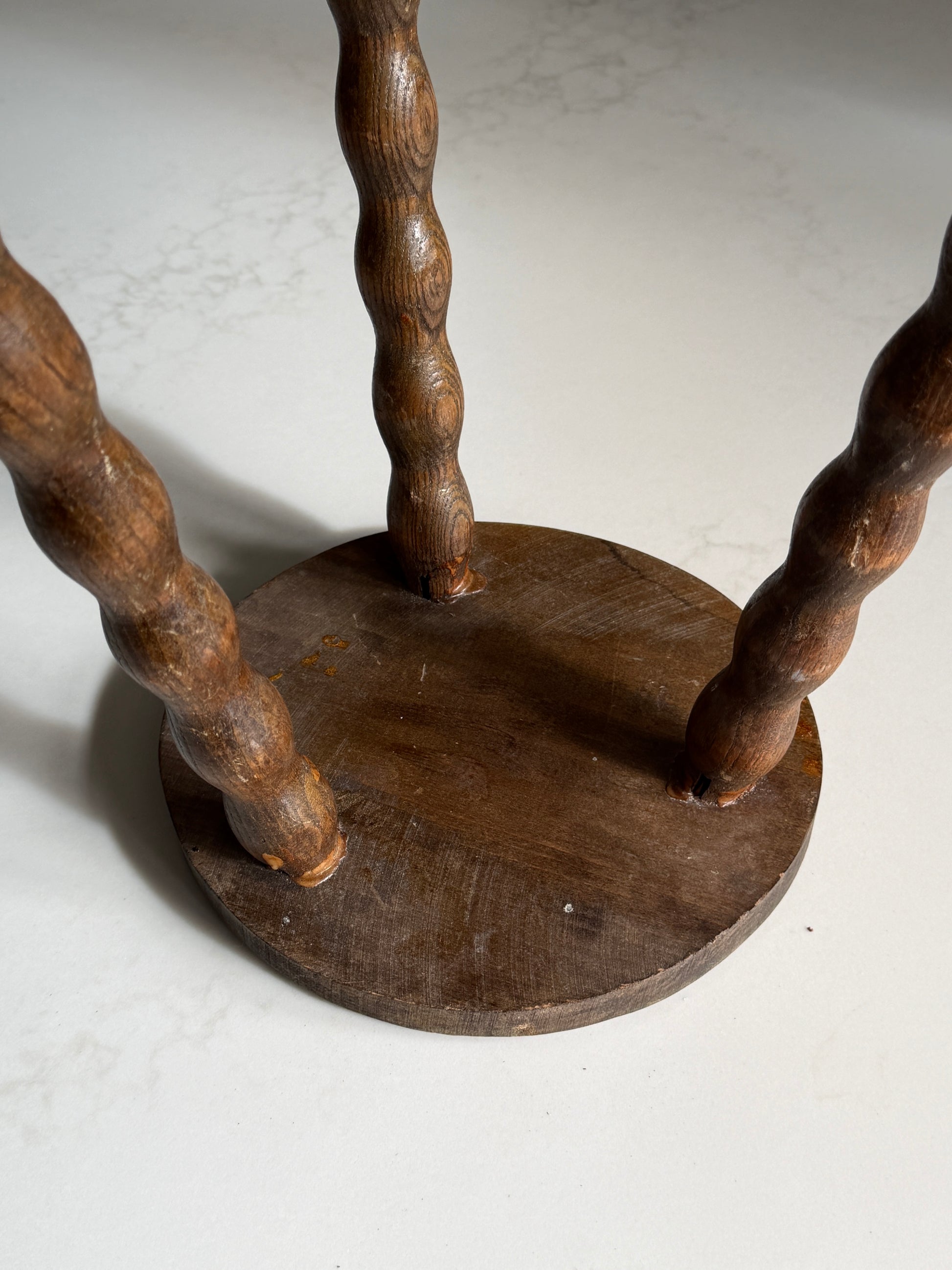 A small vintage French milking stool with a round seat and three bobbin-turned legs. Made from solid wood with a rich dark tone, showing signs of age in the surface wear and patina that give it depth and character.