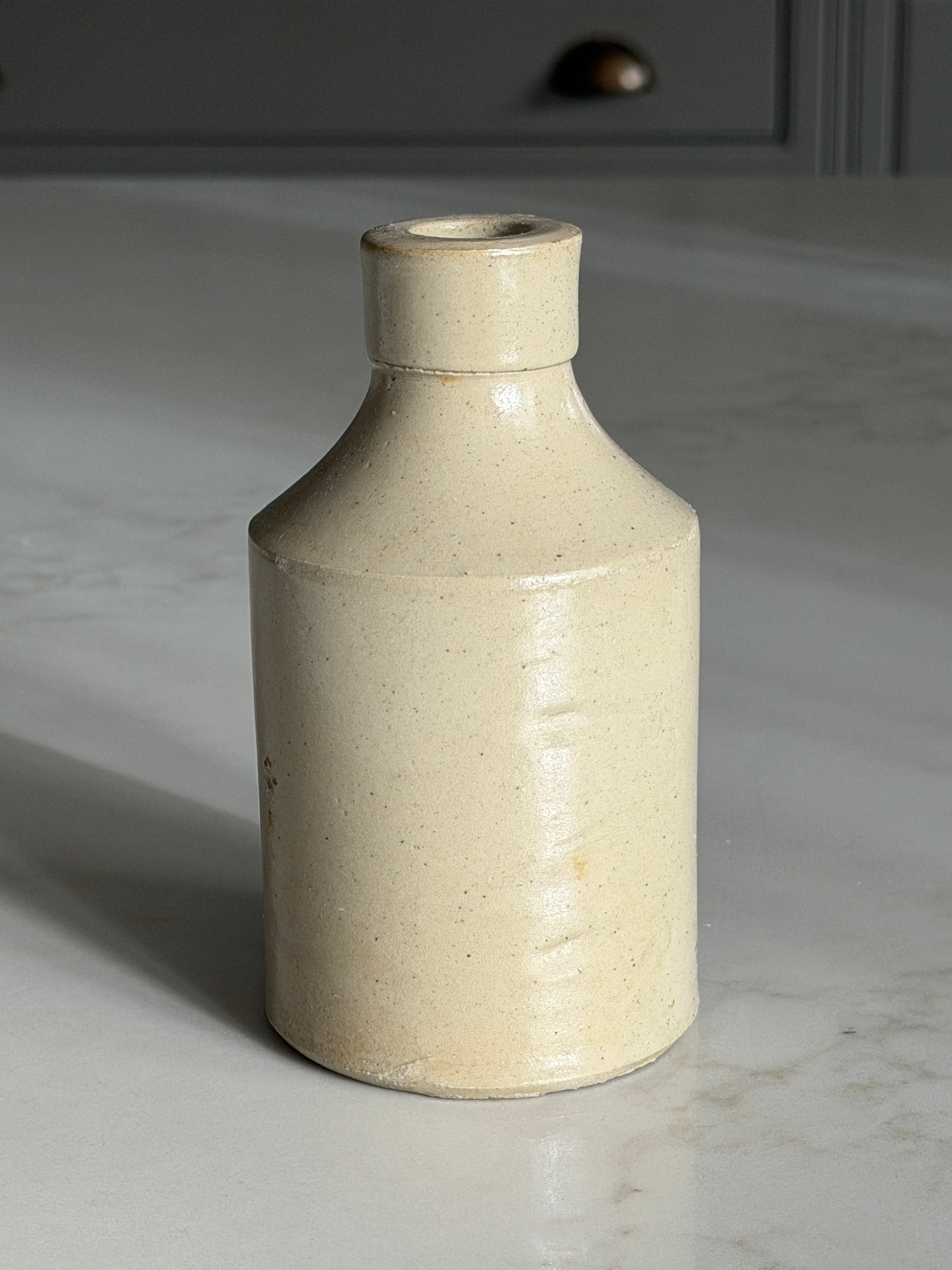 A stunning antique Victorian stoneware bottle in a soft cream shade. This bottle is a timeless styling piece, perfect for placing on your shelving amongst other decor pieces. its versatility makes it a piece you won't struggle to find a home for.