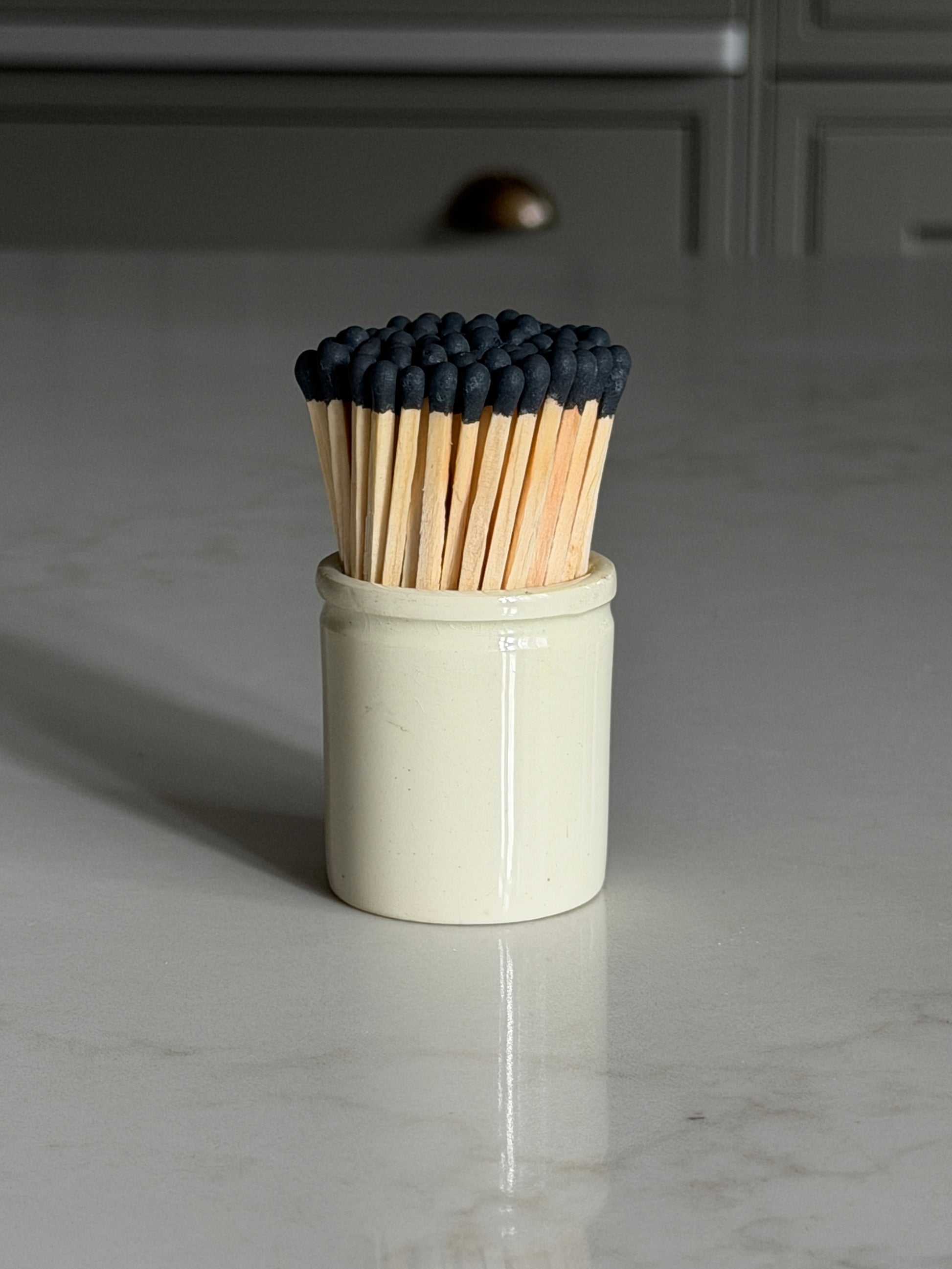 A stunning antique Victorian stoneware pot, carefully repurposed into a unique matchstick holder. For a classic aesthetic, the white stoneware is beautifully contrasted with black tipped matches, and a black honeycomb strike pad. In excellent antique condition
