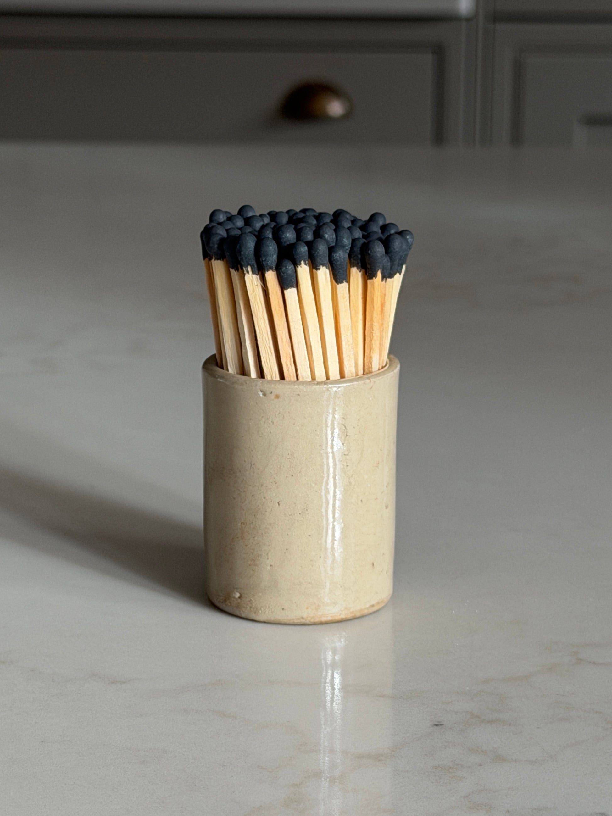 A stunning antique Victorian stoneware pot, carefully repurposed into a unique matchstick holder. For a classic aesthetic, the beige stoneware is beautifully contrasted with black tipped matches, and a black honeycomb strike pad. In excellent antique condition