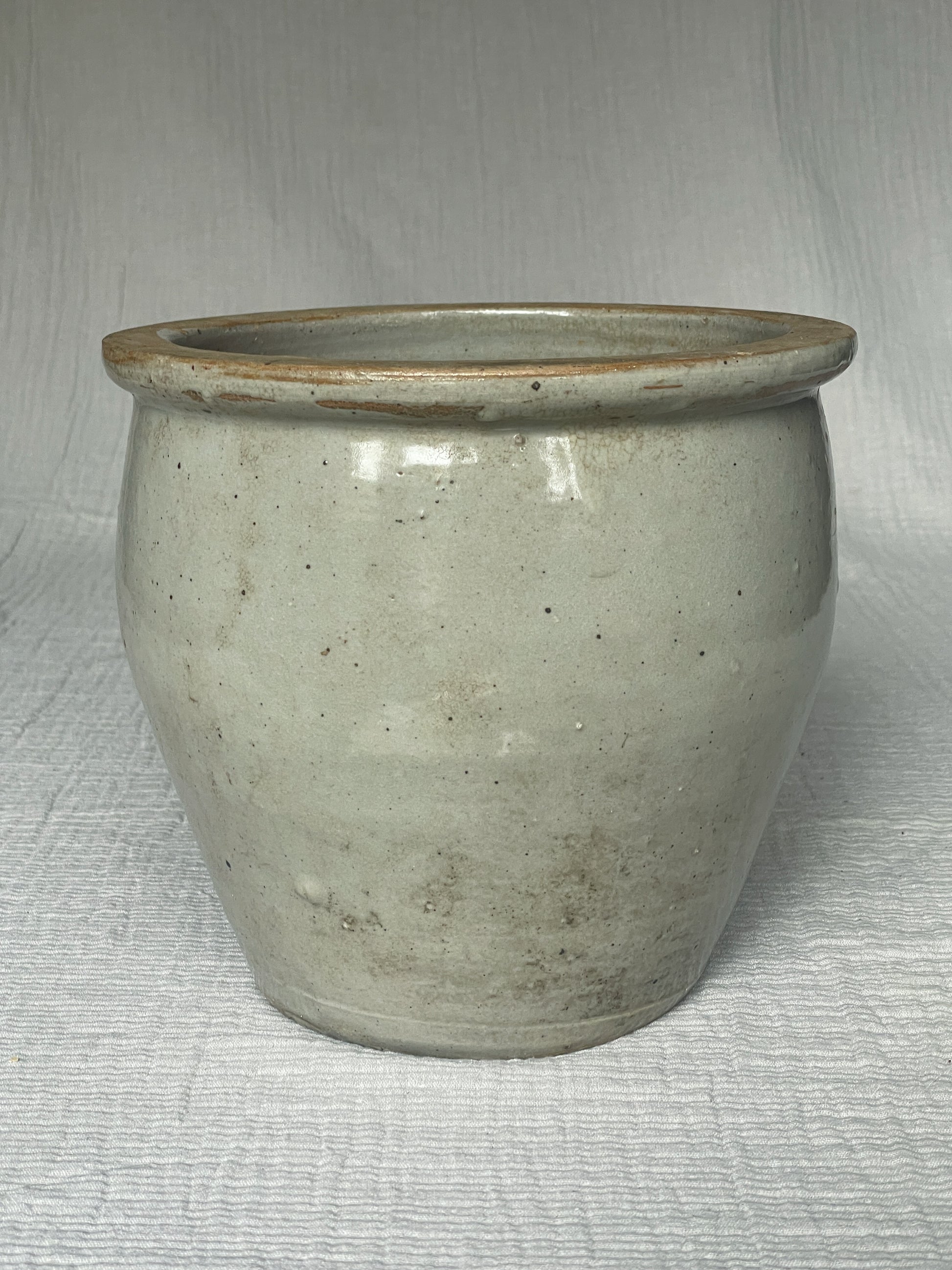 Vintage French stoneware planter in a soft greige glaze, complete with a vintage terracotta pot inside for built-in drainage. The piece has a beautiful texture and patina, offering the perfect neutral tone to complement both cooler and warmer colour schemes. This planter is in excellent antique condition, showing only light wear from age that adds to its character.