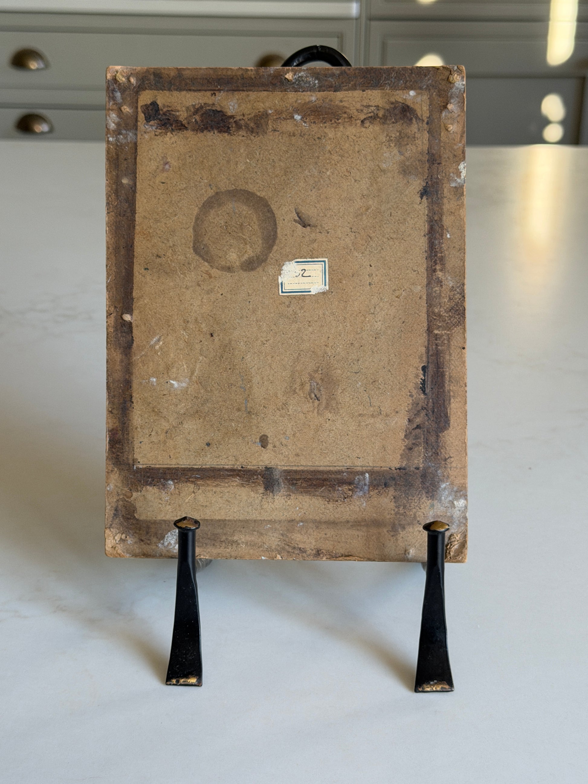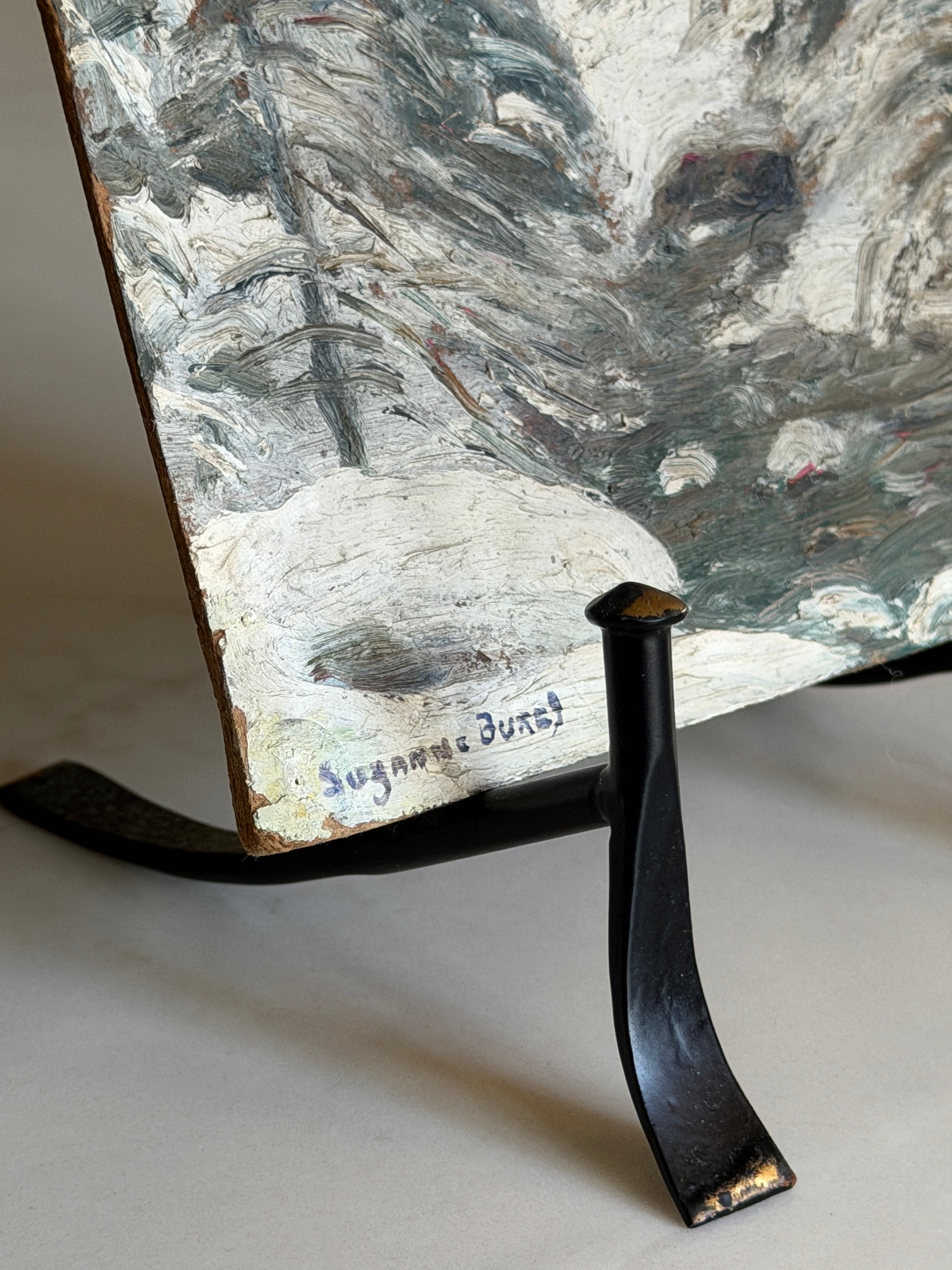A signed French oil painting on board, showing a snowy tree scene. Full of texture, with an earthy palette of greens and whites. A rare vintage piece that works beautifully for the festive season, adding depth and character to styled shelves or layered displays. In excellent vintage condition, with slight wear to the corners that speak to its history.
