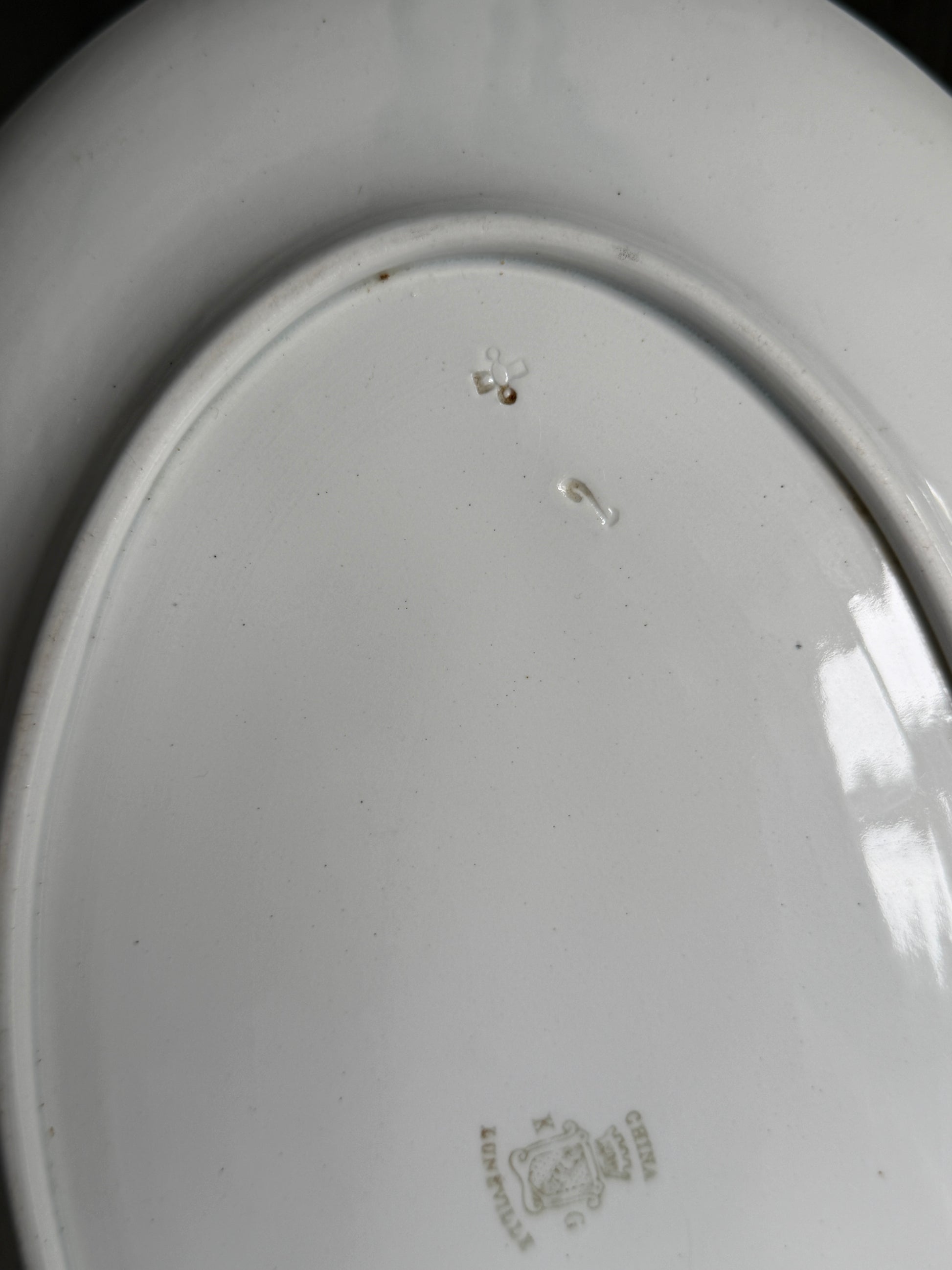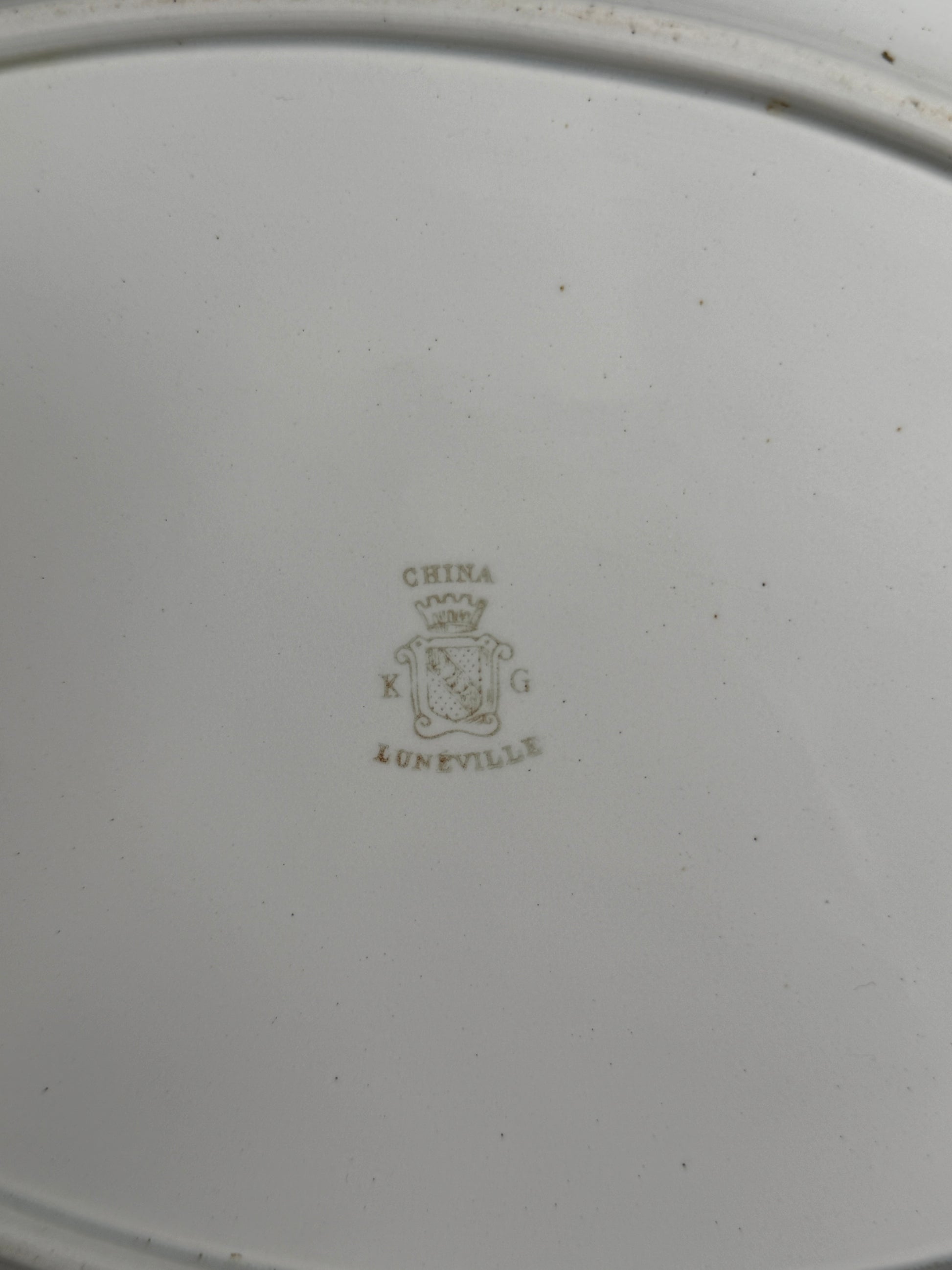 A vintage white oval serving platter by K&G Lunéville, France, known for its durable tableware throughout the 19th and 20th centuries. This piece is made from a refined white ceramic, with a clean glaze and subtle ribbed detailing.