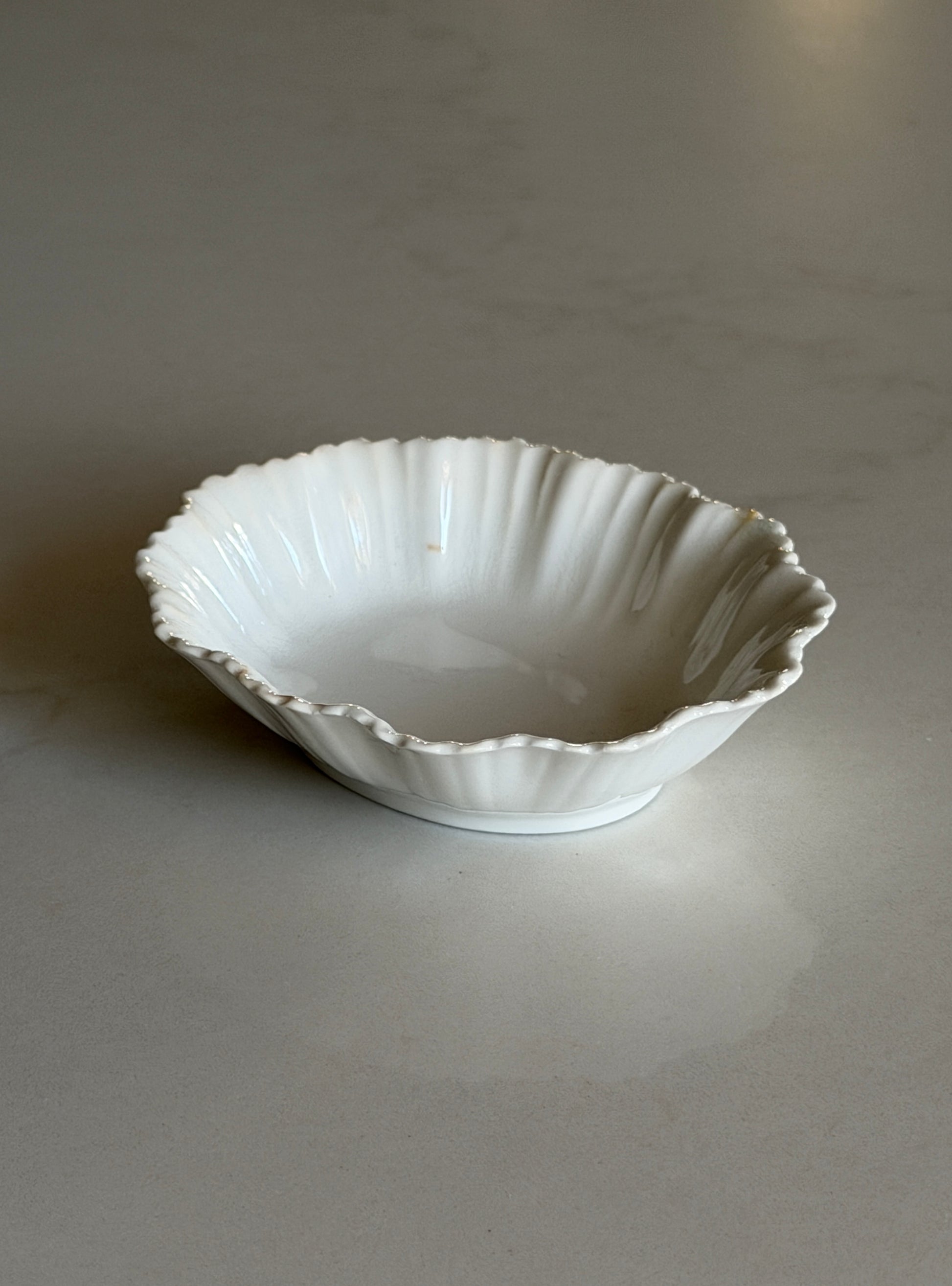 A pretty little oval white vintage trinket dish, with delicate scalloped detailing. This trinket dish is timeless in design, by Delphine & Shelley, and is made from bone china. Its compact size make it perfect for keeping jewellery or small essentials close to hand.