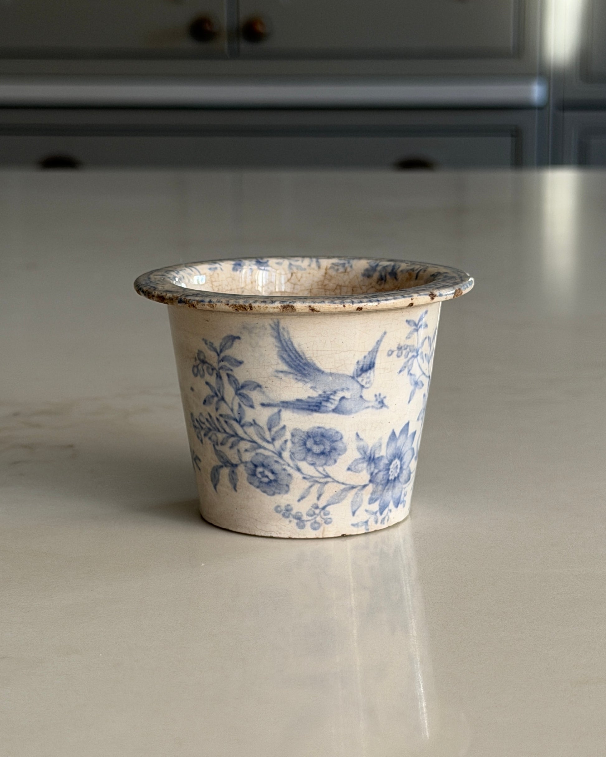 A very pretty and rare XS ceramic pot in the timeless blue & white floral design. Its compact size makes it perfect for keeping jewellery or small essentials close to hand. However, its such a standout piece, it would be beautiful styled on its own to add a pop of colour. This is one of those one-of-a-kind pieces you're lucky to come across, and it would be a beautiful addition to your home decor collection. In excellent antique condition, with colour marks inside, that speak to its history.