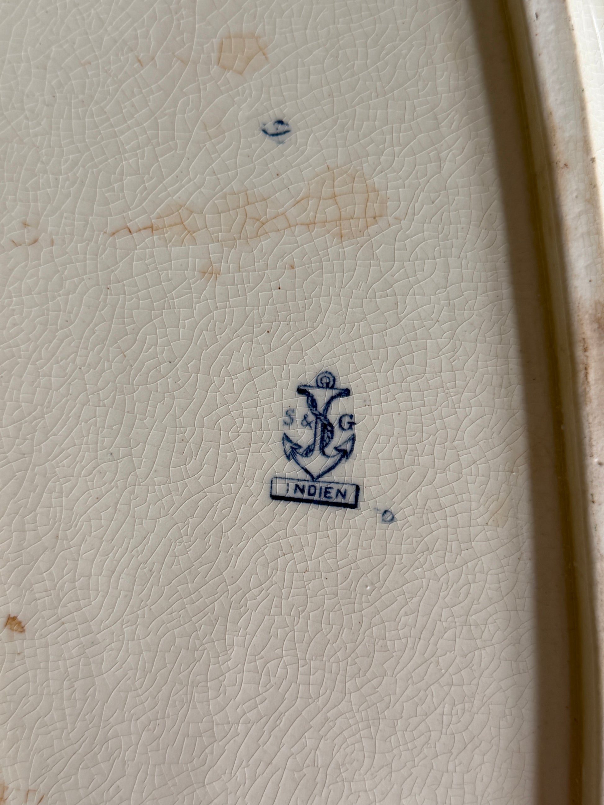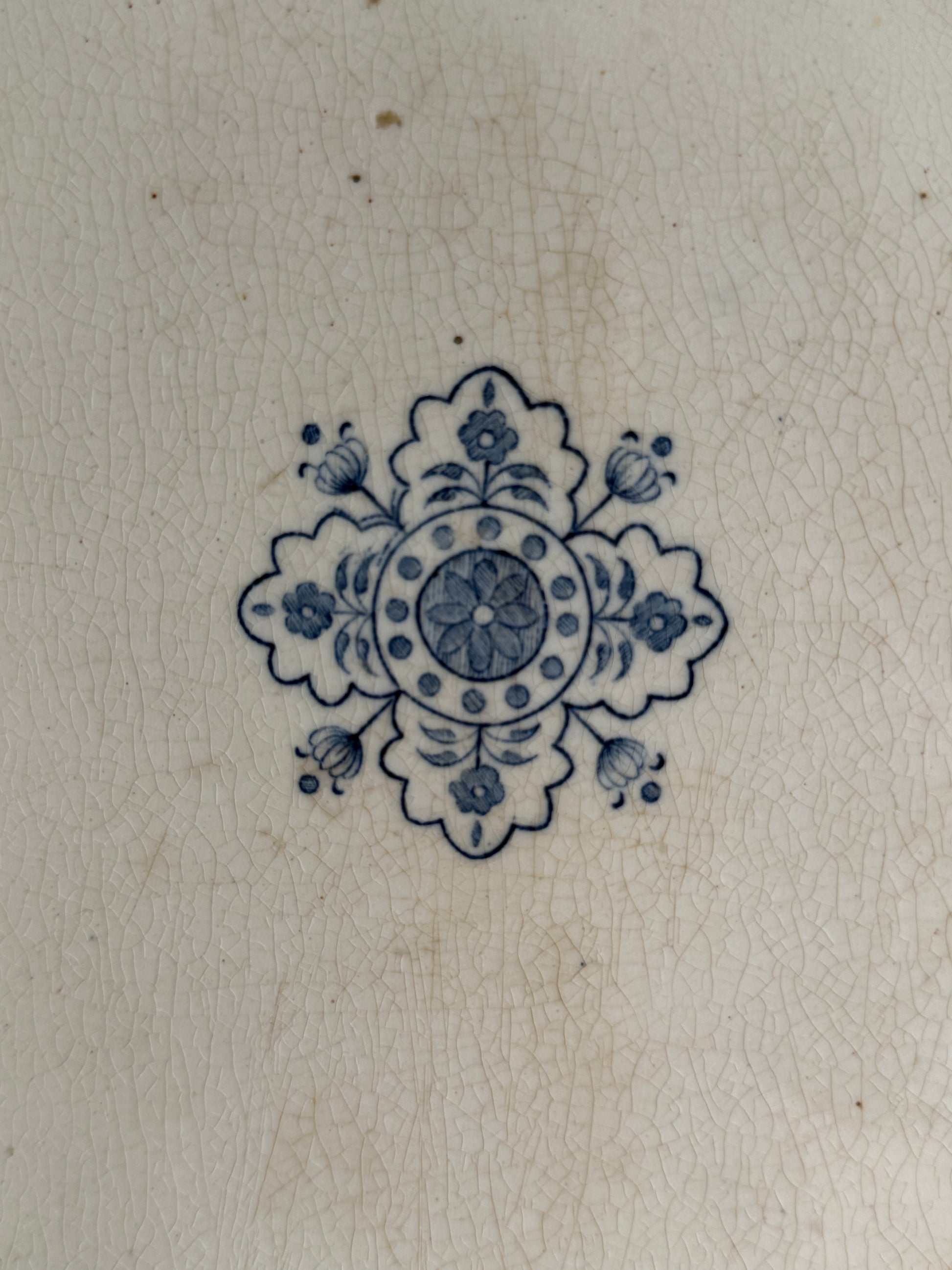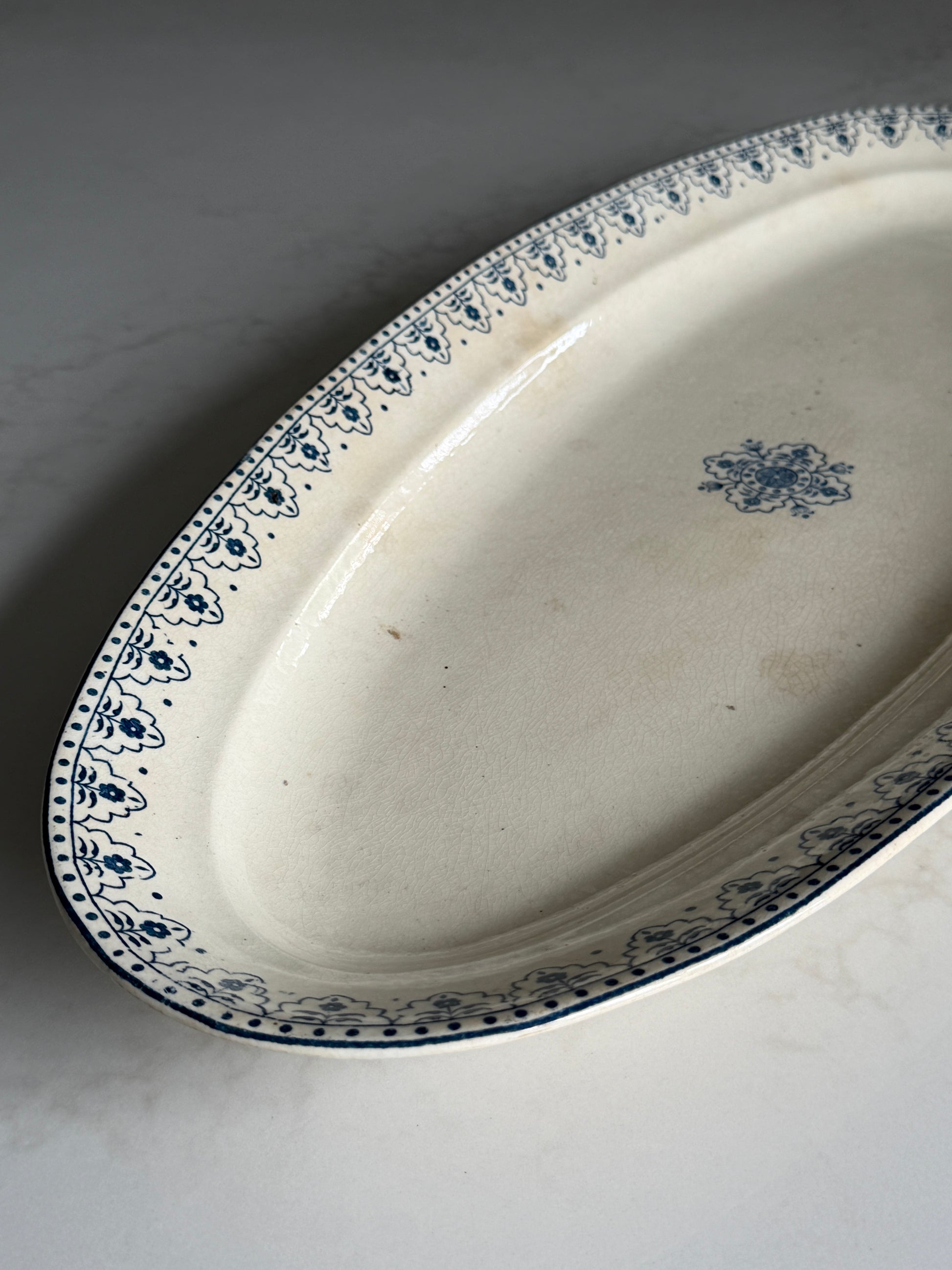 A rare and striking French oval platter, featuring a deep blue floral pattern along the border and centre. Generously sized and full of character, this is a standout piece for any serveware collection.